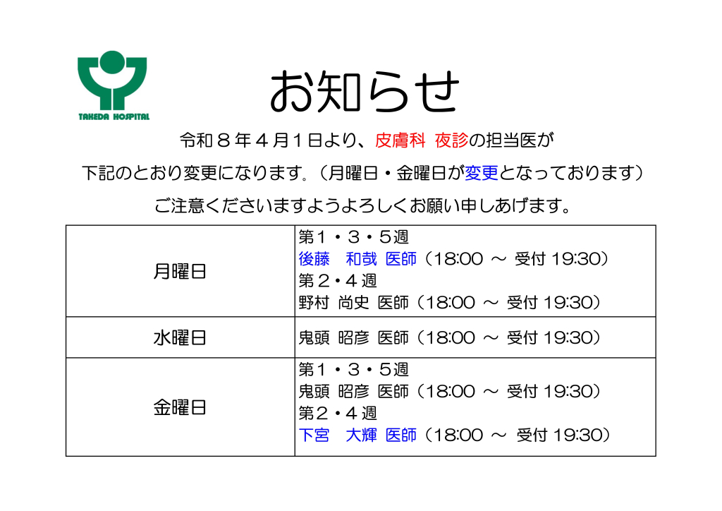 4月より皮膚科 夜診の担当医が変わります