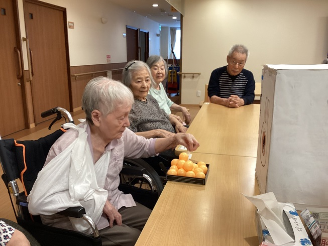 10月3日、お月見レクにてゲームを行いました。大変盛り上がり笑顔が多くみられました。ゲームの後は、おやつでニコニコ!(^^)!