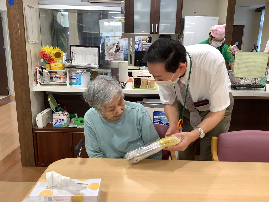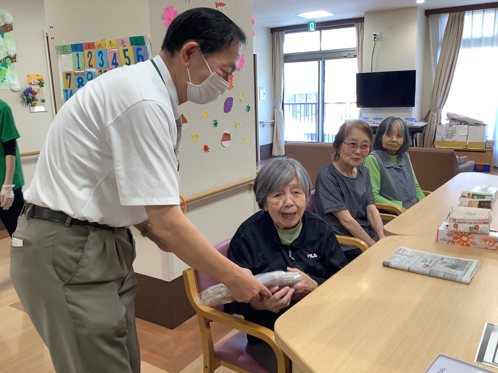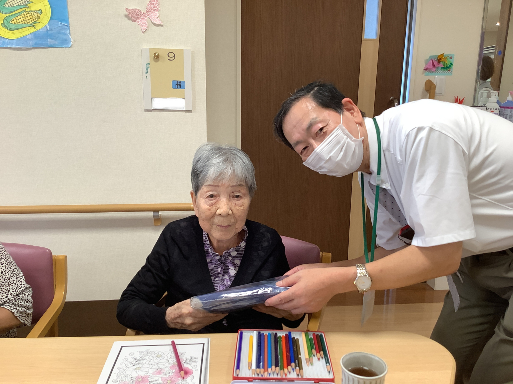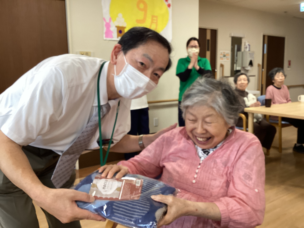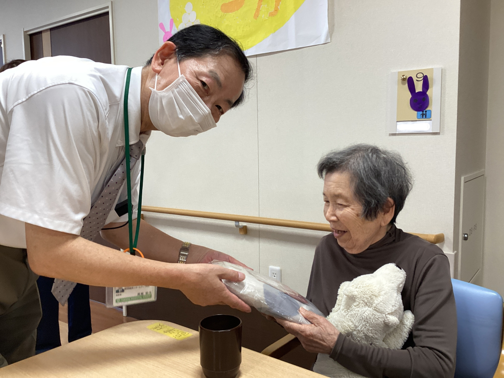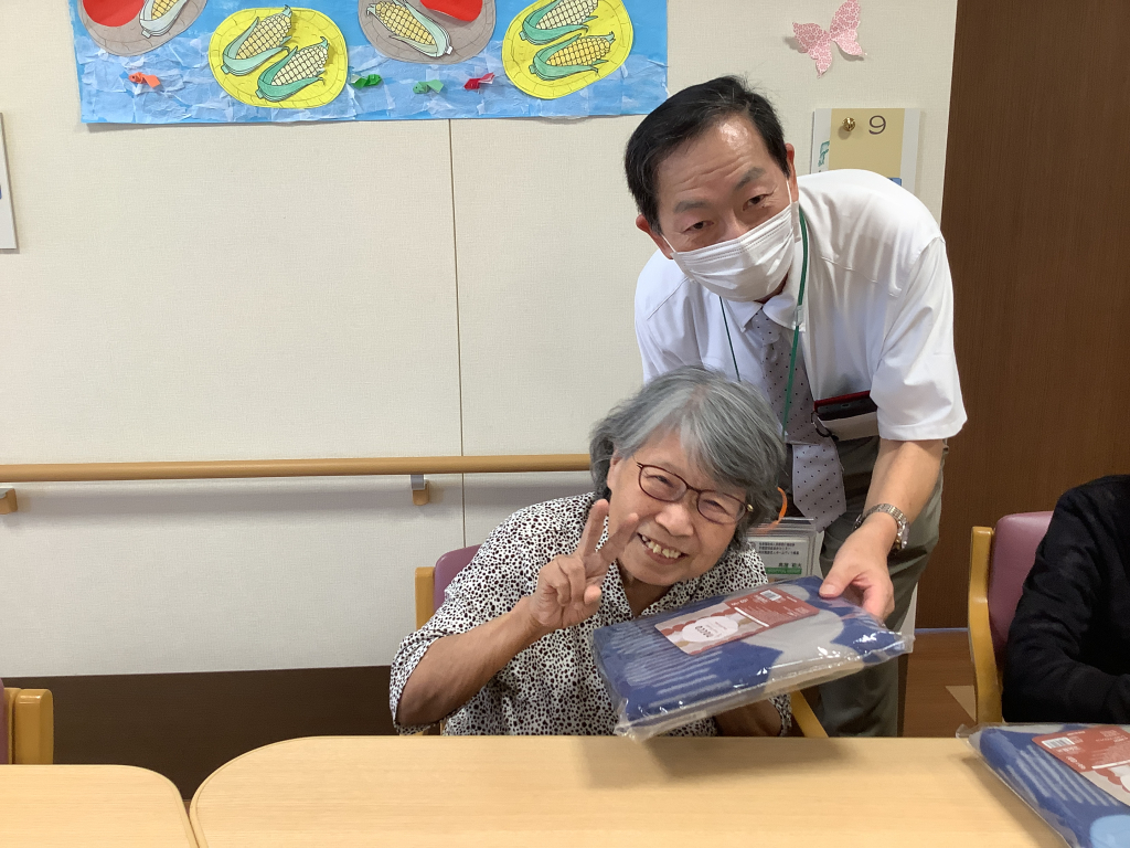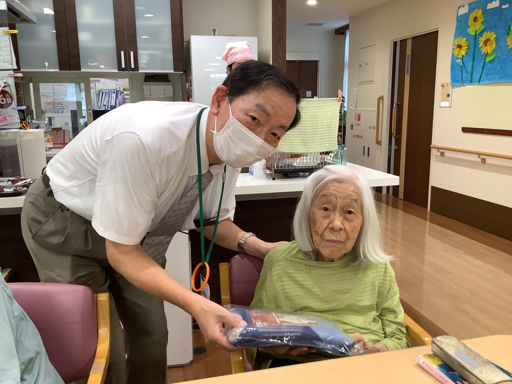 最高齢を迎えられた2名の入居者様にはバスタオルを贈呈させていただき