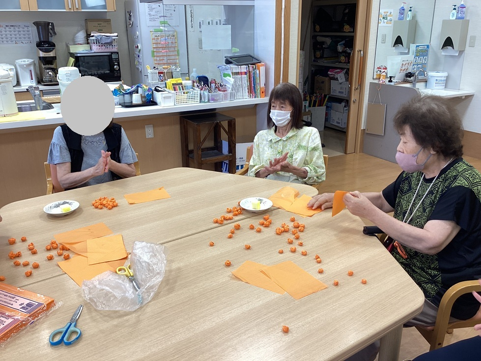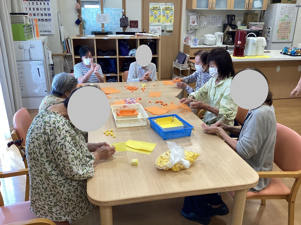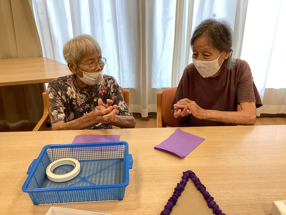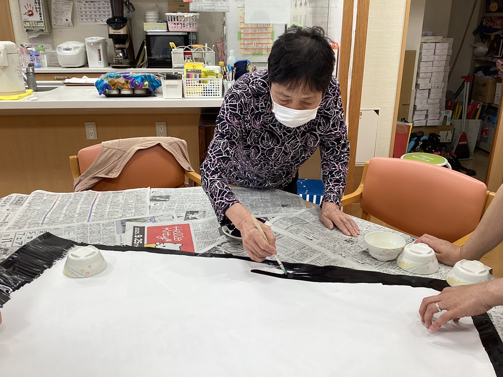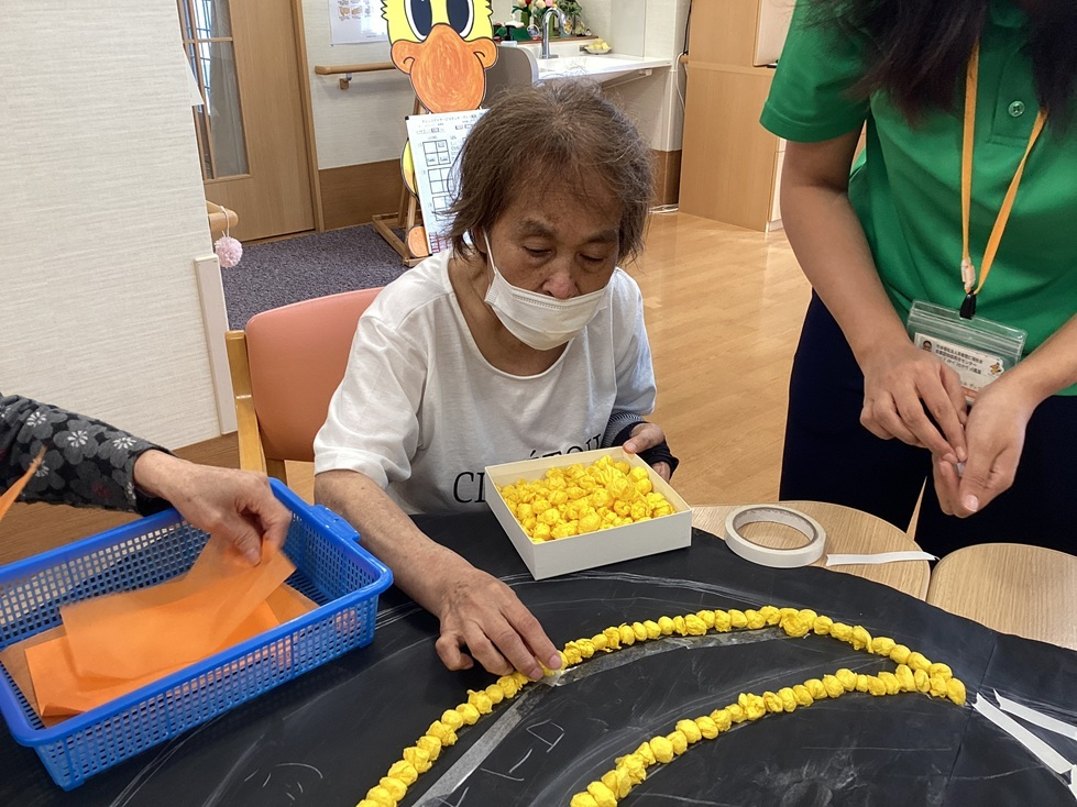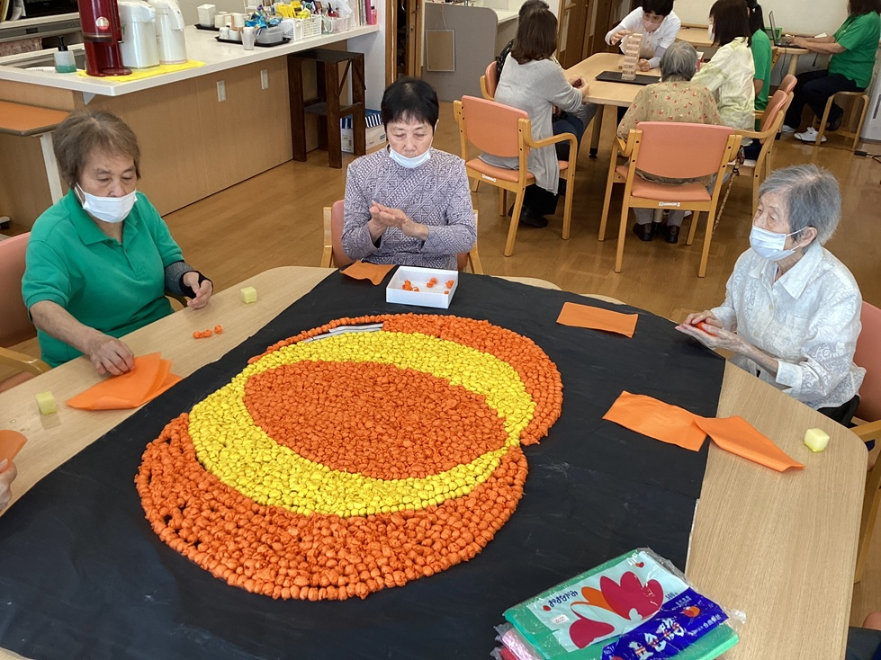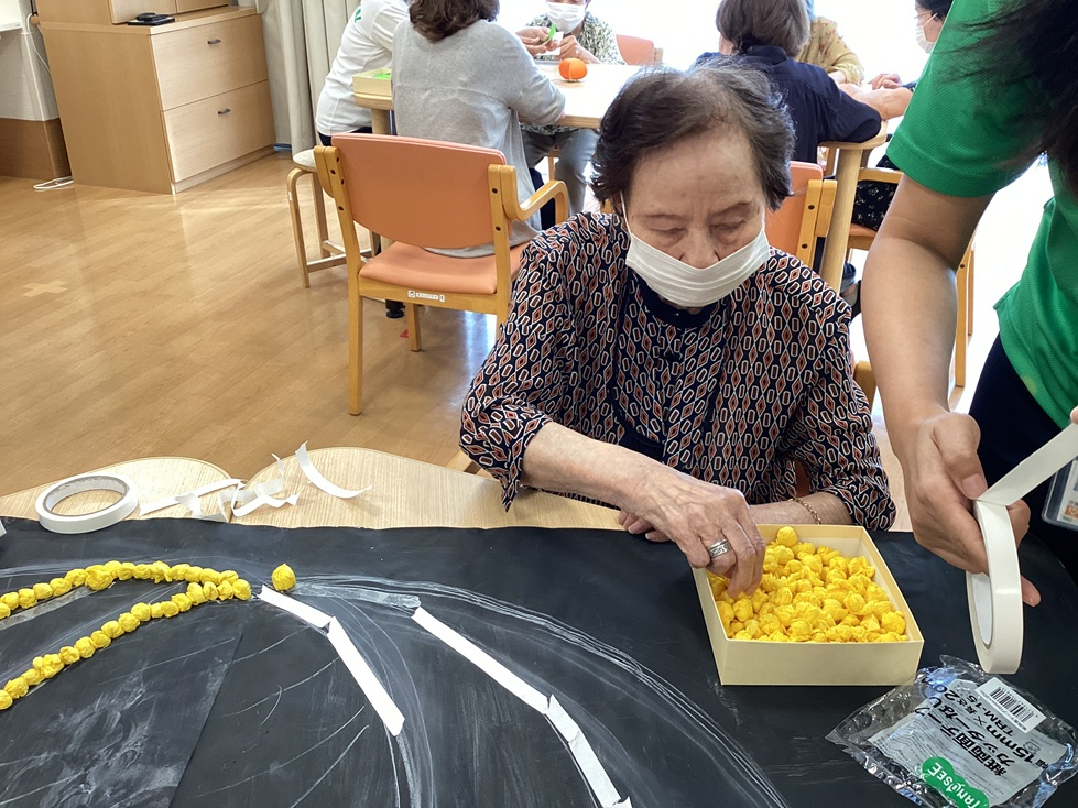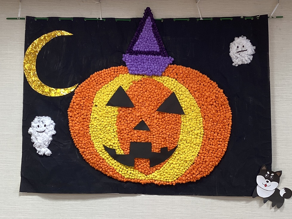 フロア内を明るく彩るために、利用者の皆様と一緒にハロウィンの壁画制作を行いました。