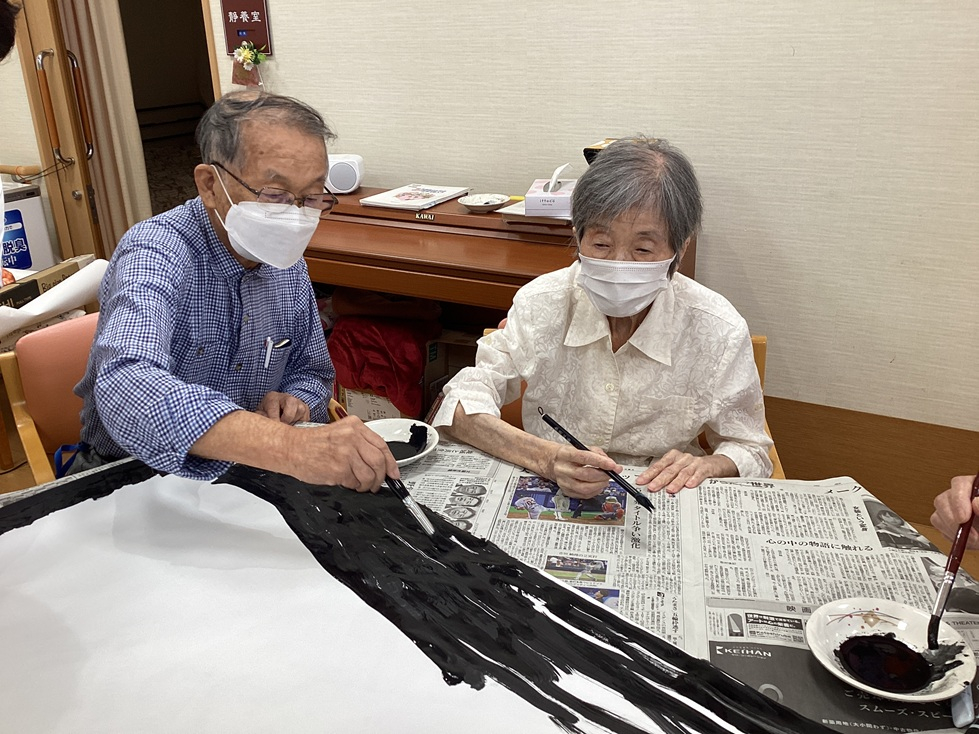 と話しながら、筆を使って、協力して模造紙を塗っていきます。