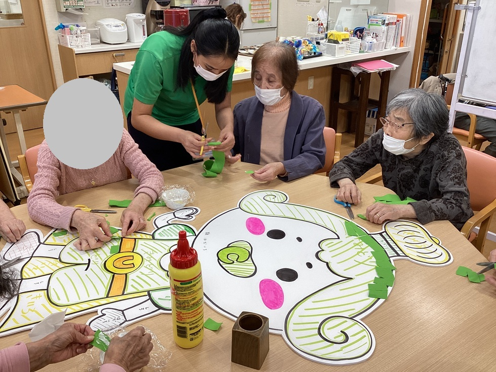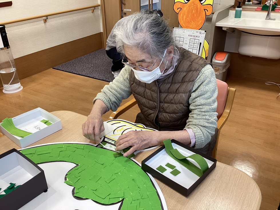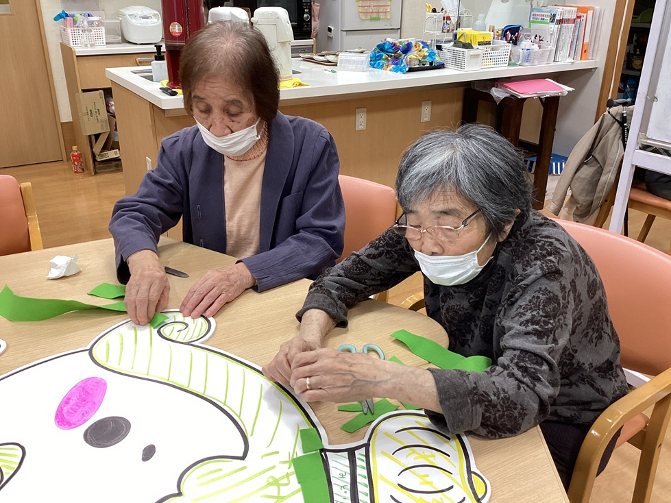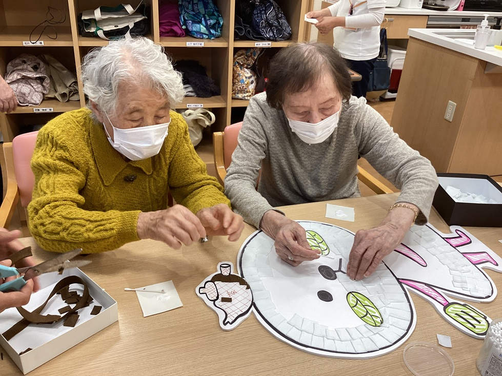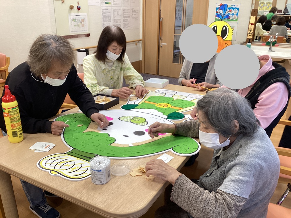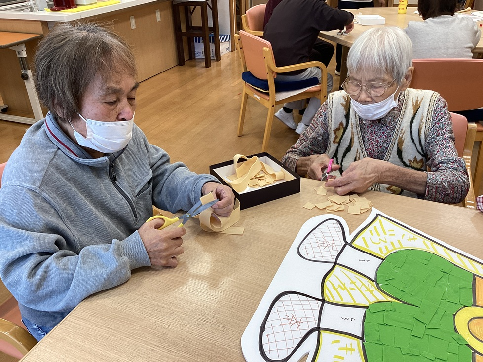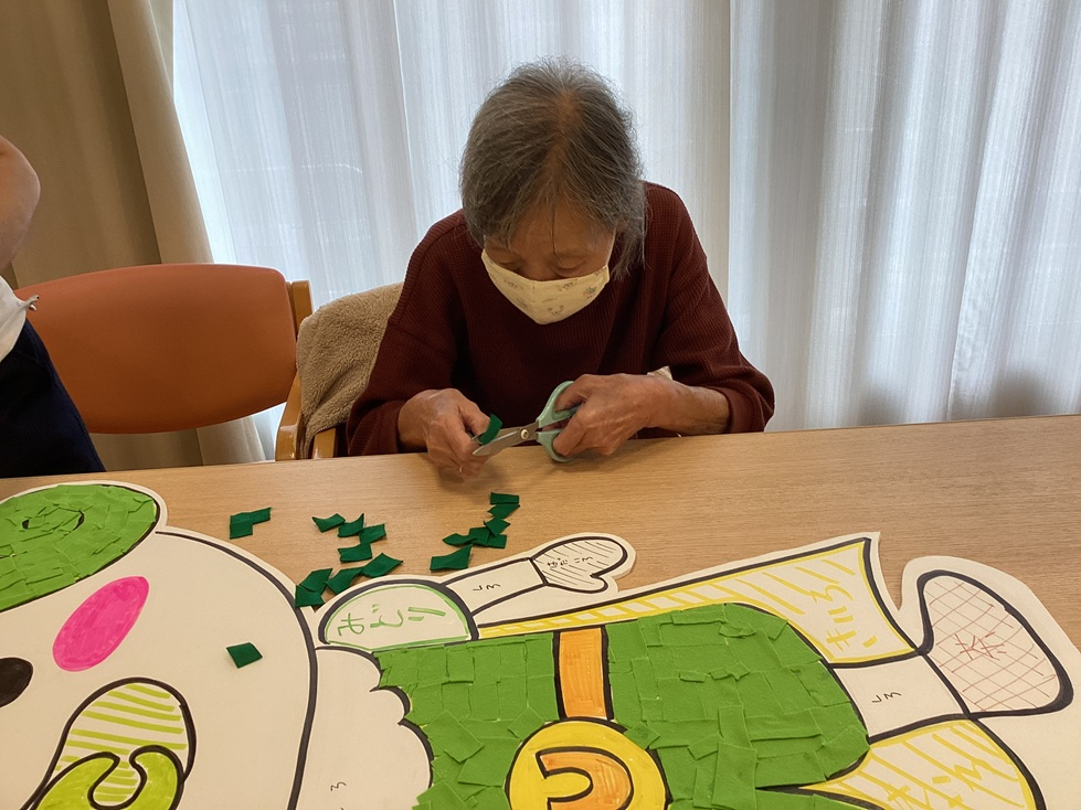 職員が書いた下絵にフェルトを使った貼り絵作業に取り組まれました。フェルトは柔らかく手触りもよいため、高齢の方でも扱いやすい素材です。