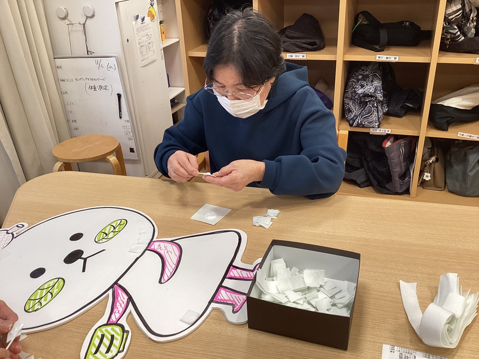 ご利用者は、キャラクターの色に合わせてフェルトの色を選んだり、はさみを使って小さく切ったりと、集中した表情で取り組まれていました。