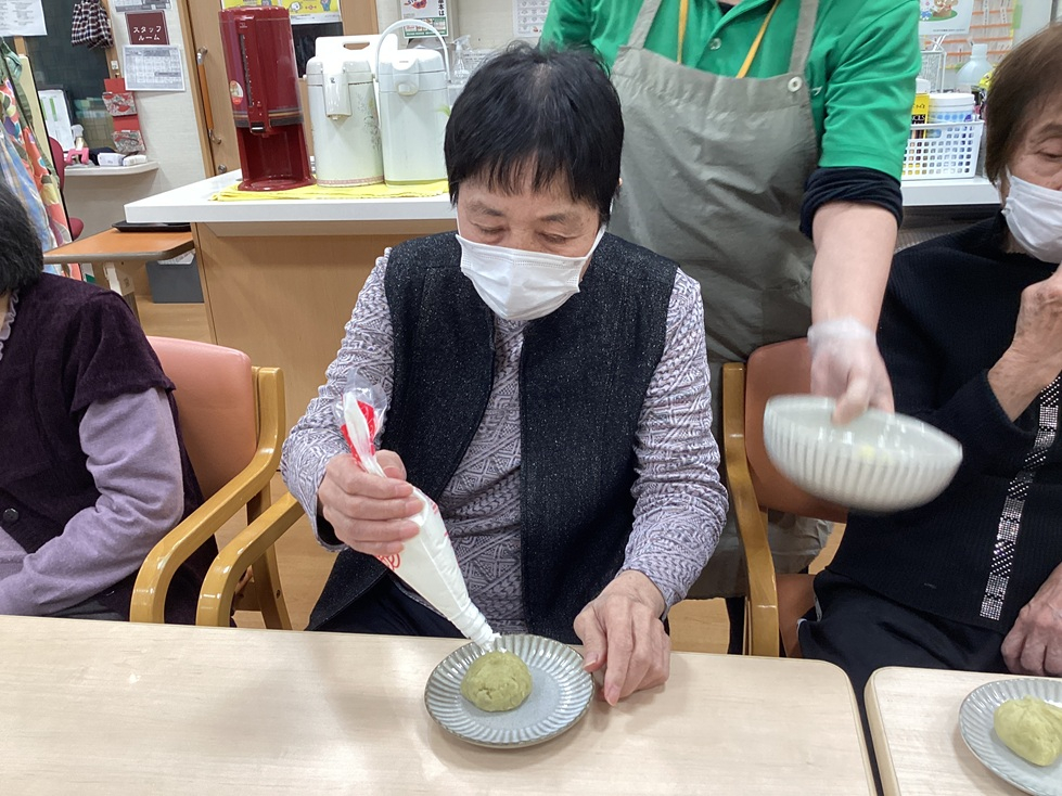 11月27日(木)おやつレクリエーションとして「さつまいもの茶巾絞り」を皆さまと一緒に作りました。
