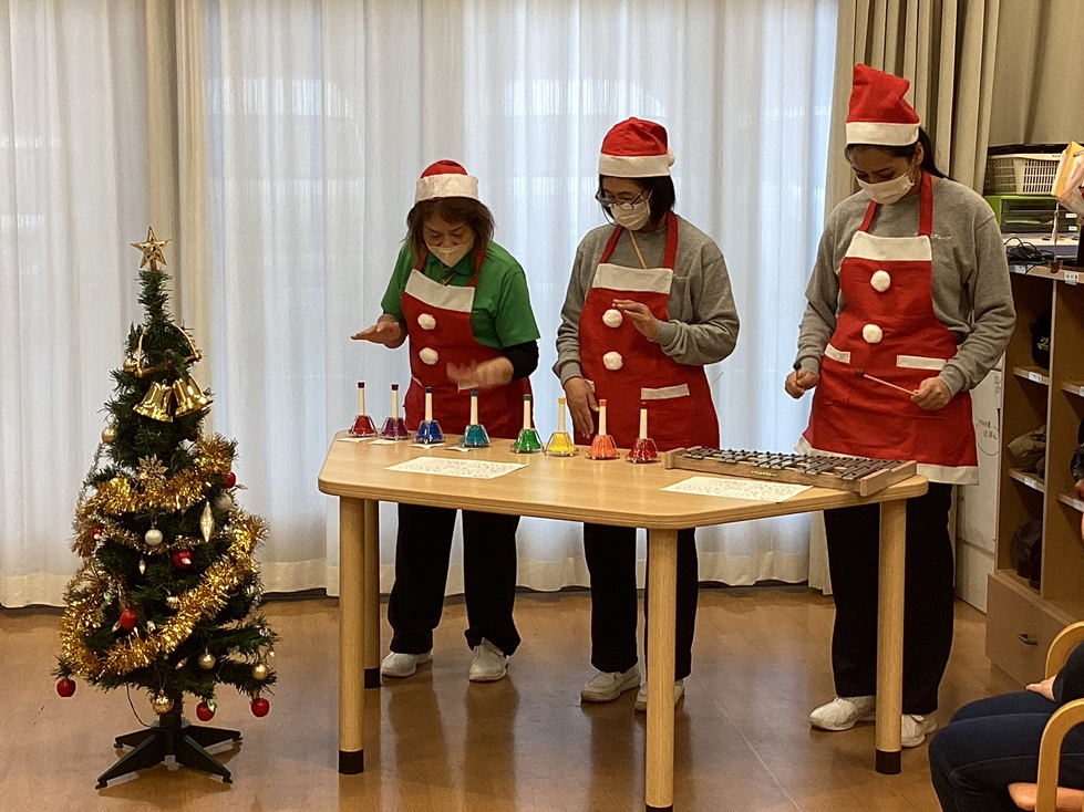 はじめは、職員によるハンドベル・グロッケン演奏で「きらきら星」「ジングルベル」を披露しました。優しい音色が会場に響くと、ご利用者は手を叩いたり口ずさんだりしながら、演奏に耳を傾け、微笑む姿が多く見られました。