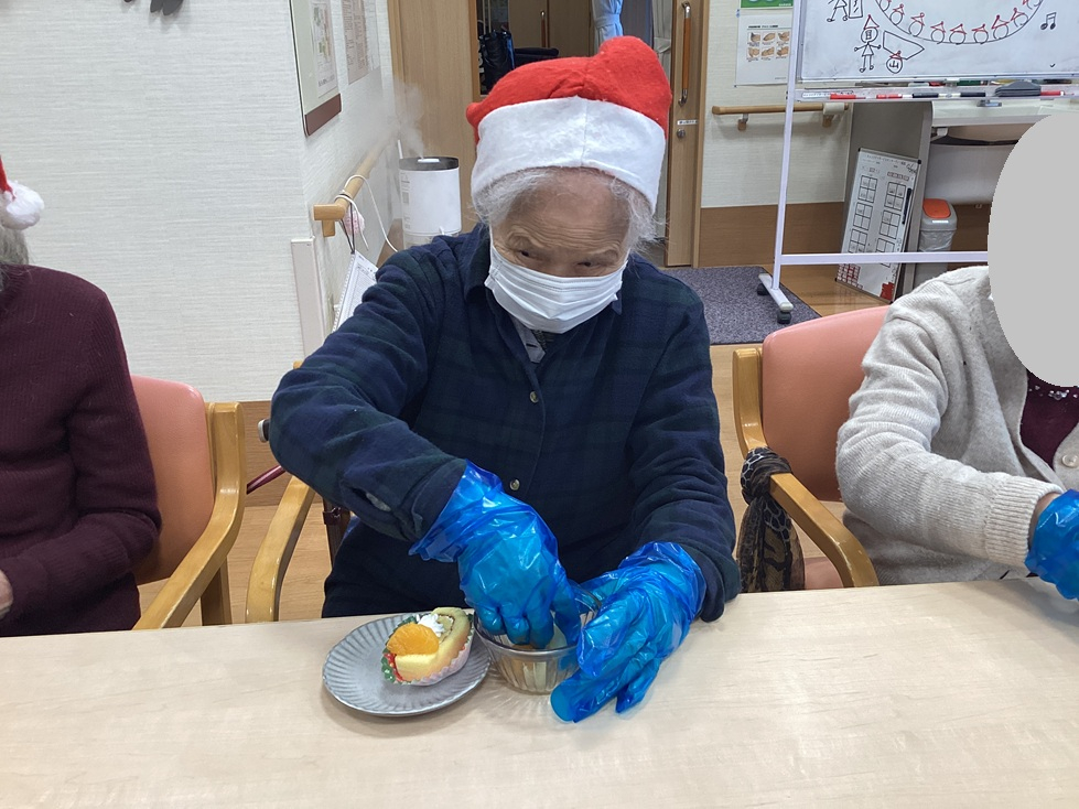 今回のクリスマス会では、音楽や手作りおやつを通して、ご利用者同士の交流や職員とのふれあいがより一層深まり、会場は笑顔と温かさにあふれる1日となりました。普段はあまり声を出さない方も笑顔で参加され、季節を感じながら心豊かに過ごすことができました。ご利用者にとって思い出に残る、心温まるクリスマスのひとときとなりました。