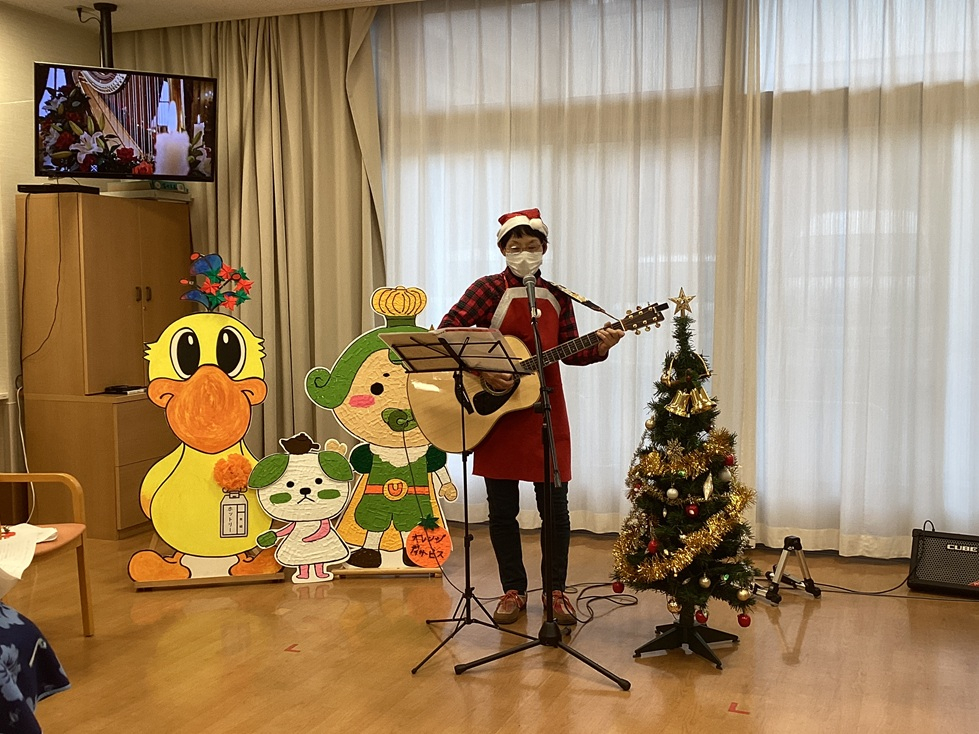 続いて、ボランティア様によるギター演奏と職員のピアノ伴奏に合わせ、皆さまで歌唱を楽しみました。クリスマスソングとして「あわてんぼうのサンタクロース」「赤鼻のトナカイ」「きよしこの夜」を歌い、手拍子や笑顔があふれる楽しい時間となりました。「サンタさん来るかな」「赤鼻のトナカイ、かわいいね」と会話も弾み、ご利用者同士の交流も自然と深まりました。