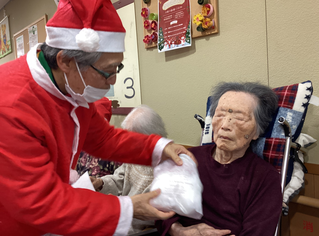 集まった利用者様にサンタクロースからプレゼントを手渡しで