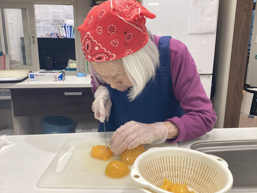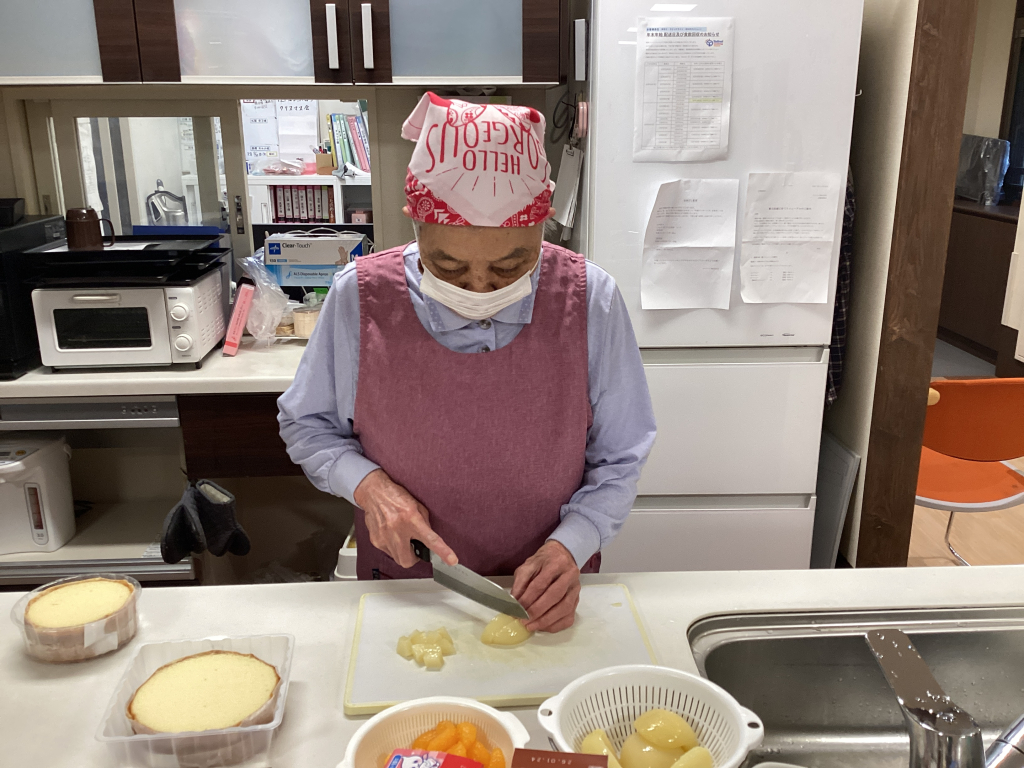 ケーキに添える果物を切ってもらい
