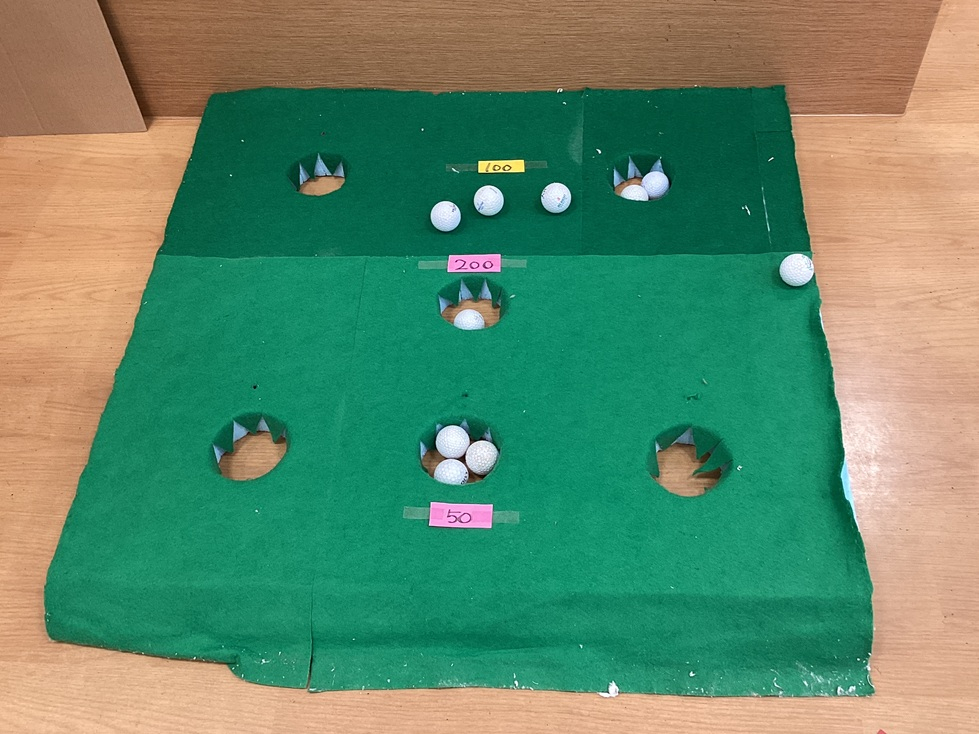 パターゴルフといっても、ただ転がすだけではありません。狙うカップの点数に合わせて力加減を調整する、意外と頭と体を使うスポーツです。