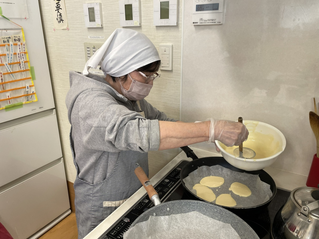 生地を焼く際は、「うまく丸くなるかな?」「いい色になってきたね」と、自然と会話も弾みます。焼き上がる甘い香りに、表情もほころびます。