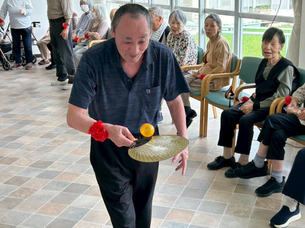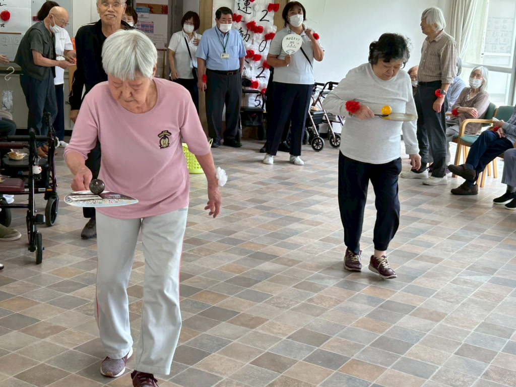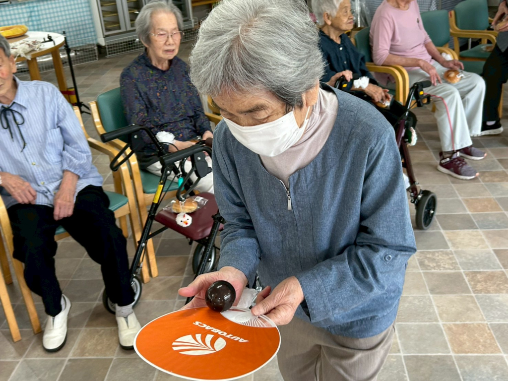 うちわの上に玉を乗せて落とさないようにバランスを保って、