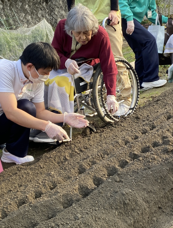 畑では、いつもお世話になっているMさんに教わりながら、赤色、黄色、白の球根を植えていきました。ご利用者さんも器用に穴に球根を投げ入れられ、拍手がわいていました。