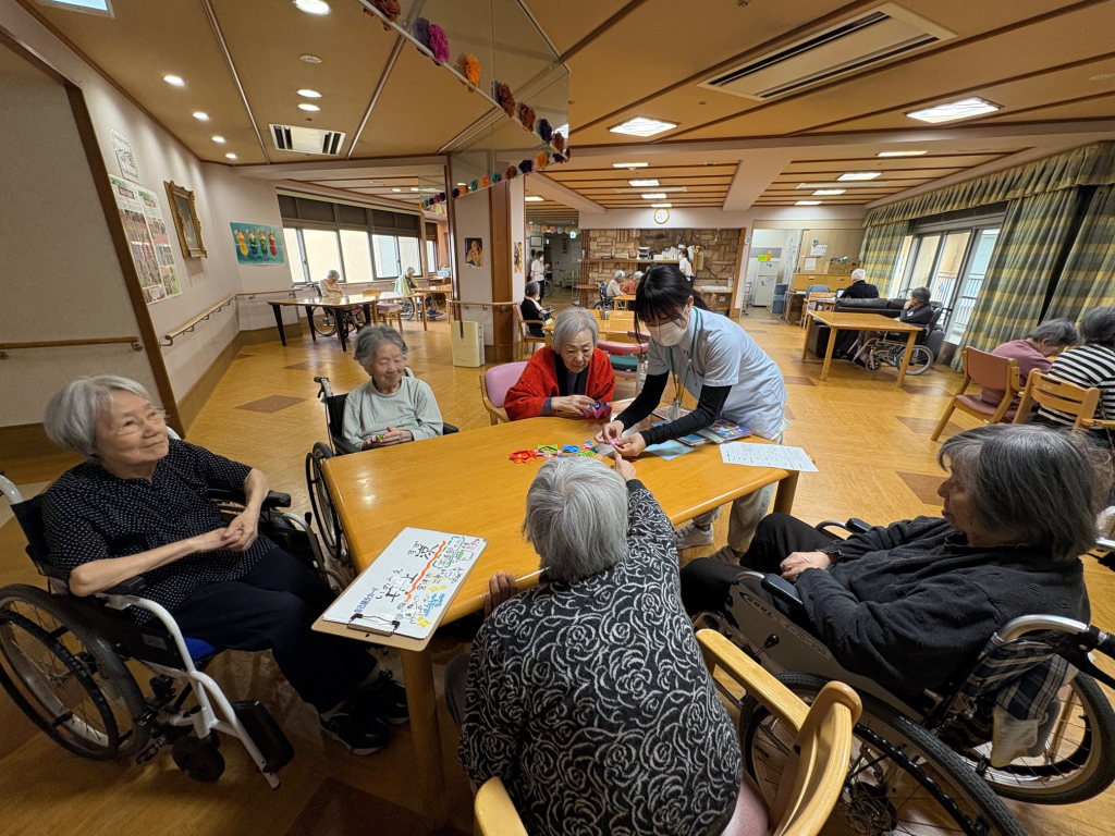 実習生)の手つきに注目し、時にご利用者同士で相談したり助け合いながら、真剣な表情で取り組まれました。