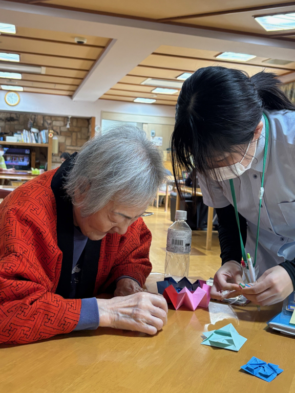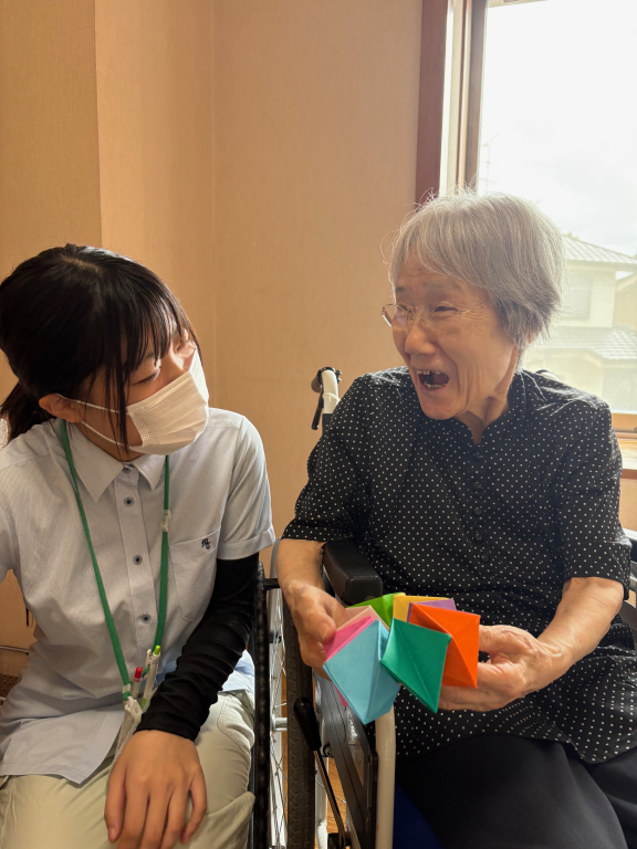 「折紙かあ、昔はようしたけどなあ、もう忘れてもた」「次はどう折るの?」皆さん先生(