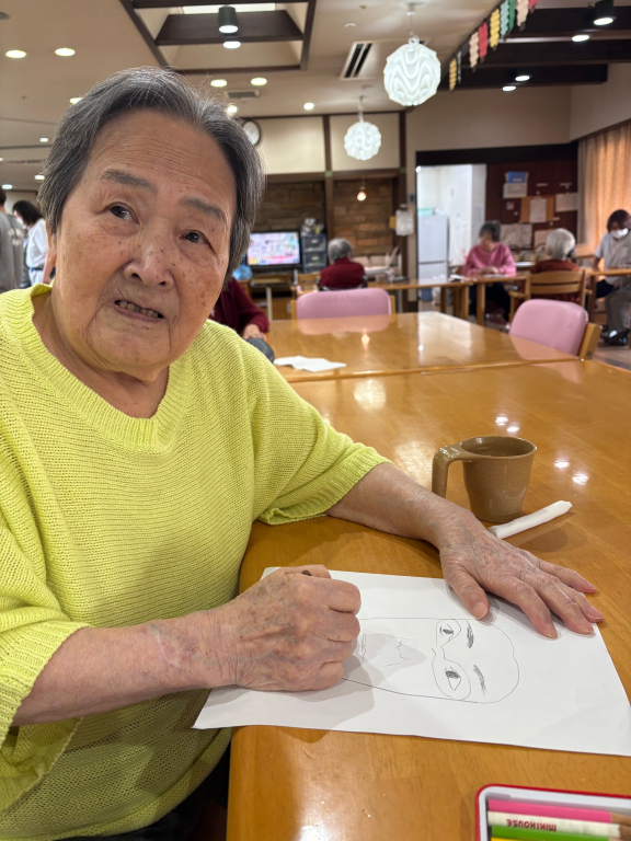 職員が「私の顔を描いてほしいです」とリクエストすると「描けるやろか~」と言いながらサラサラと描き始められました。