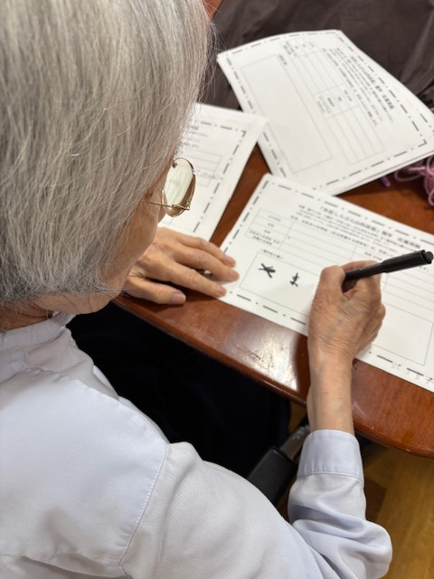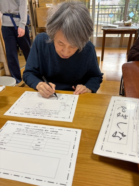 そこで、ご利用者の皆さんと「やましな」の字を書きました。「ひらがなって難しいなあ」「漢字の方がかんたんやけど、ひらがなは味があるな」と言いながら、それぞれの「やましな」が書けました。