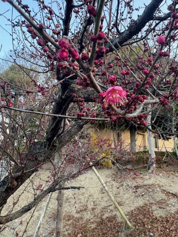 駐車場側の梅の木は、毎年いちばん早く花をつけます。