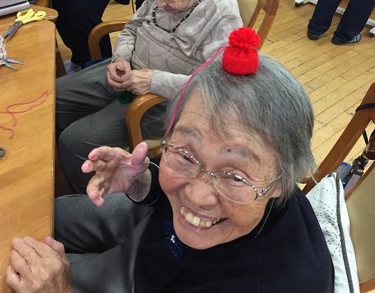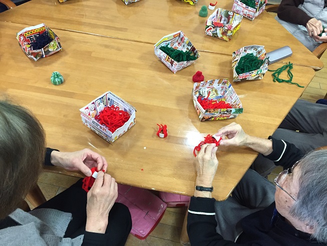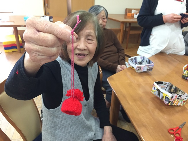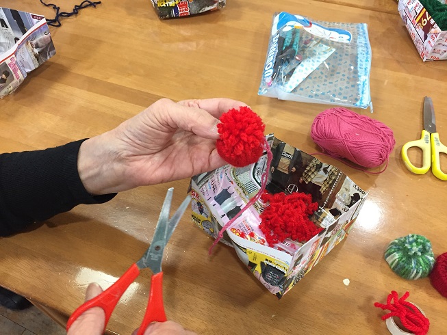 レクリエーションの時間に毛糸とラップの芯を使ったニット帽のキーホルダーを作りました。