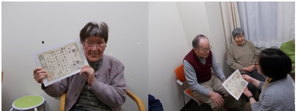 昨年度より取り組んでおります、回想法サークル(今回は令和1年7月2日~令和2年1月7日の間に計12回実施しました。)にグループホームとオレンジデイサービスの6名の皆さんが参加されました。回想法とは、本人になじみが深いものに触れながら、ご本人や相手の昔の経験等を語りあう事により脳が活性化されたり、気持ちが安定する効果がある心理療法です。毎回1時間程度一つのテーマについて回想法を行いました。一番人気のテーマは「昔の流行歌」でした。青春時代の流行歌から皆さん昔を懐かしまれ、お話も大変盛り上がり楽しい時間を過ごして頂きました。1月7日には、回想法サークルの修了式を行いました。職員手作りの修了証書を笑顔で受け取って下さいました。