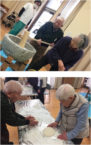 利用者の皆さんは慣れた手つきで臼とりをしたり、鏡餅を作ったり。