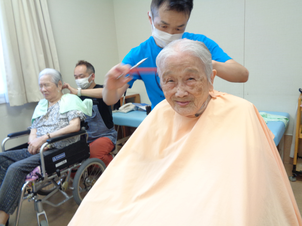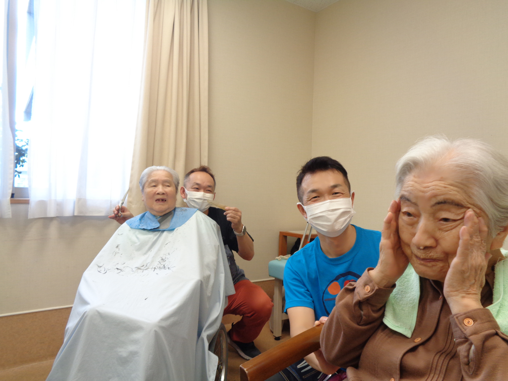 ヴィラ鳳凰では、理容・美容の事業所様のご協力を頂き、毎週月曜日に施設内で散髪サービスを行っています。髪型や髪の色を変えて気分転換される方、髭を剃ってもらってさっぱりとされる方…皆さん思い思いのひとときを過ごされています。