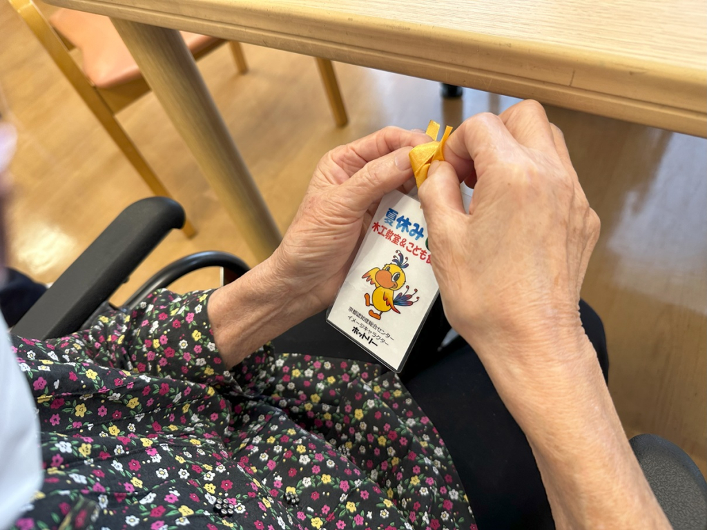 7月19日(土)午後のレクリエーションで、明日、カフェほうおうで開催される『木工教室×こども食堂』にてプレゼントされる、手作りしおりの制作を、ご利用者様が心を込めてお手伝いしてくださいました!