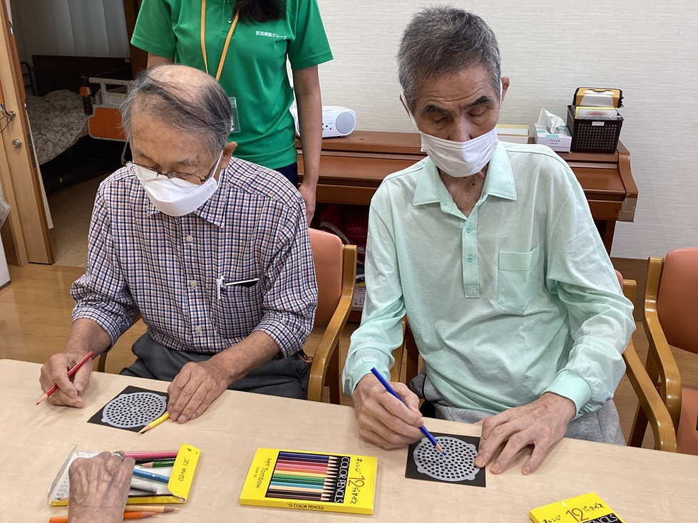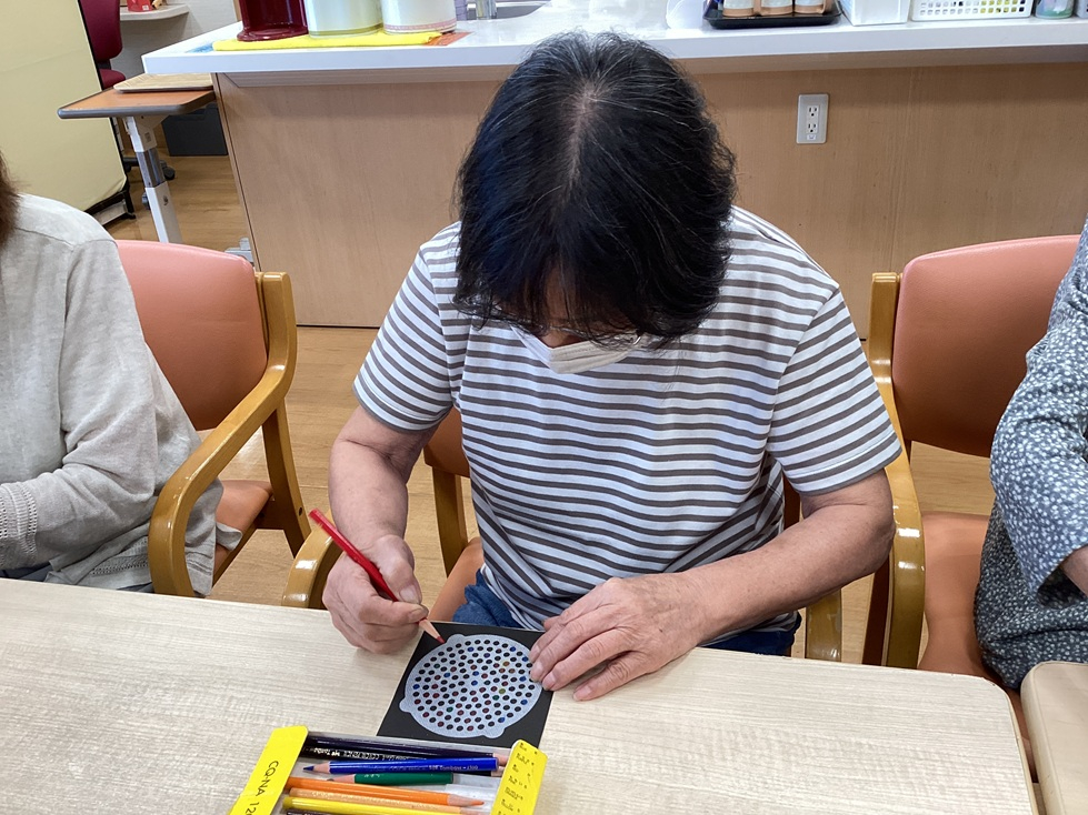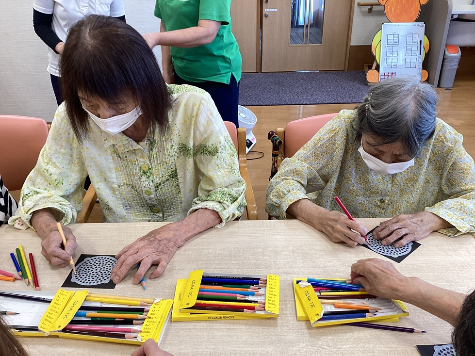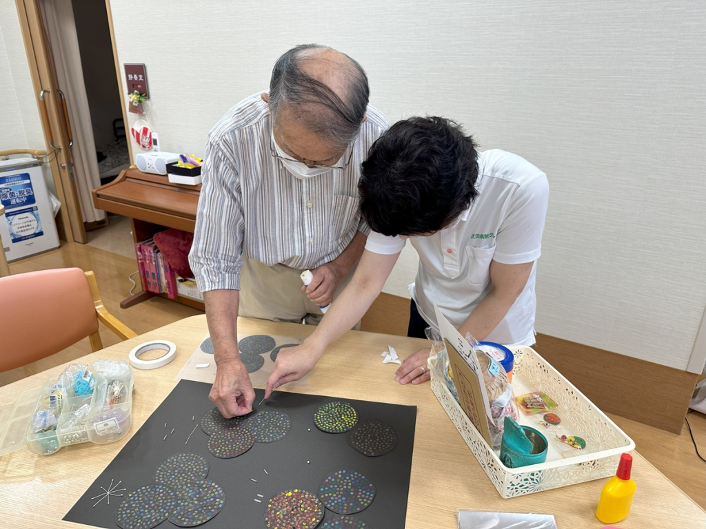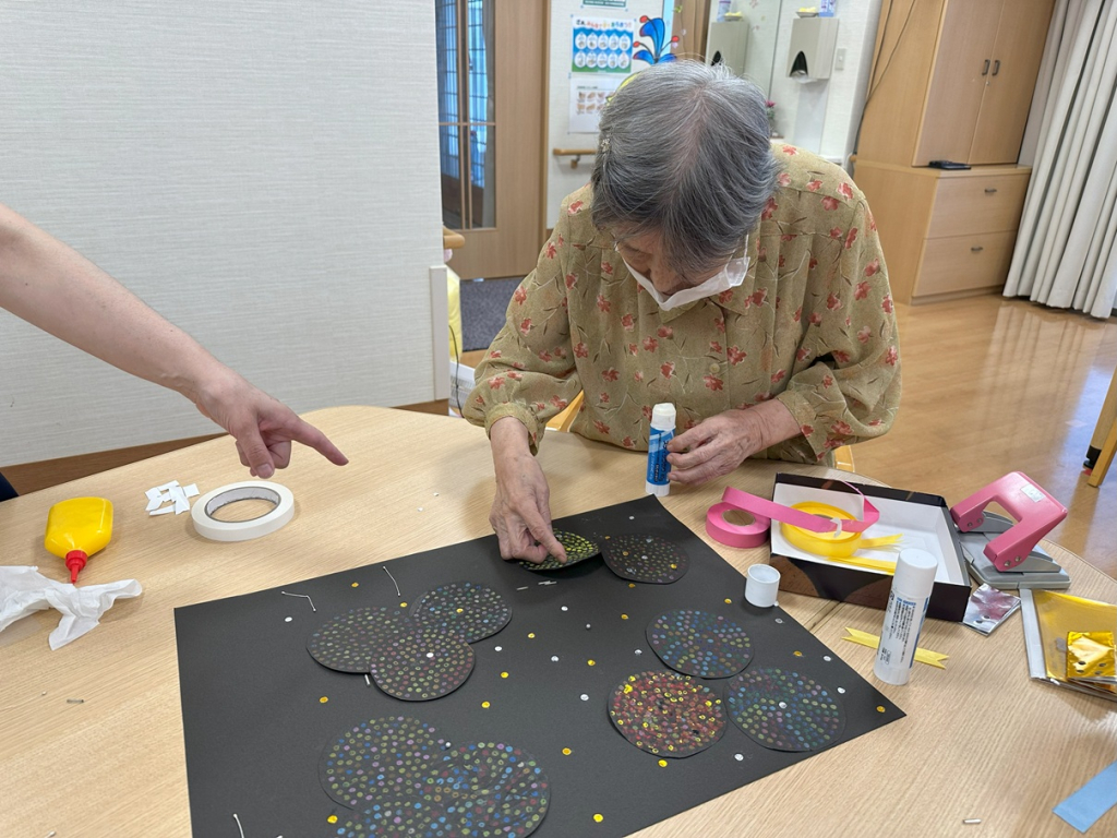 今回は、ご利用者の皆さまと一緒に、花火をテーマにした制作レクリエーションを行いました。