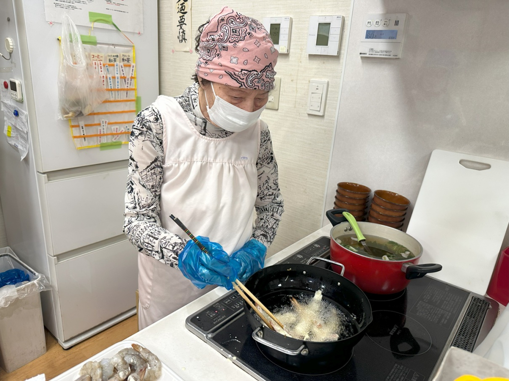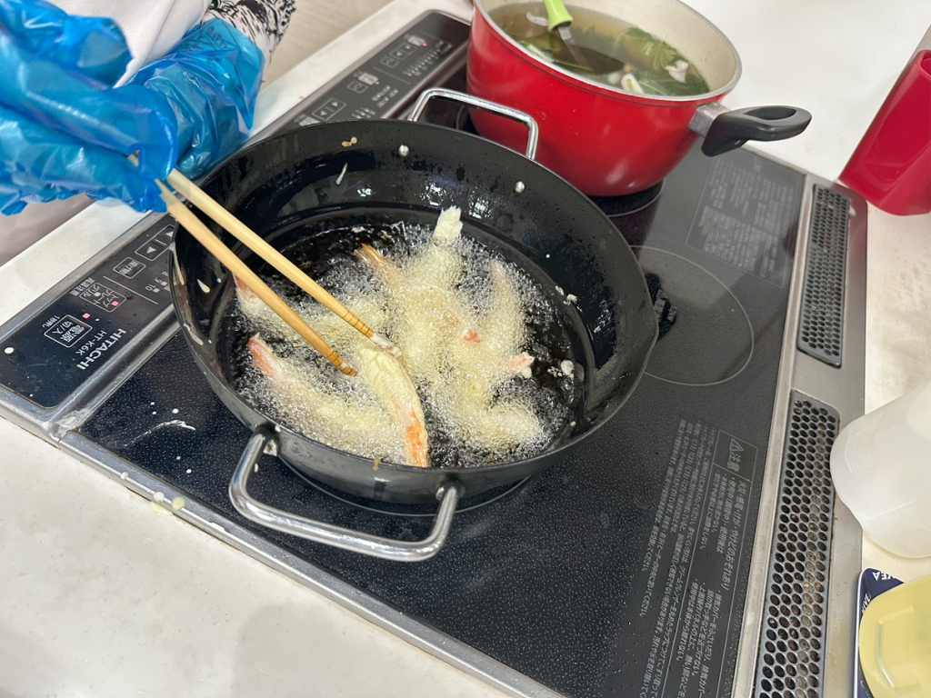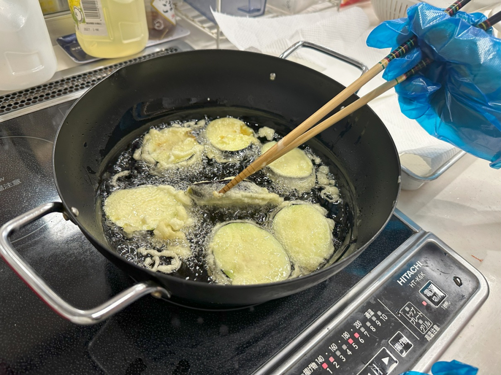 サツマイモやナスもカットして衣をつけ、いざ油へ。揚げたての香ばしい香りが厨房いっぱいに広がり、「おいしそう〜!」「揚げるの上手だね!」という声があちこちから聞こえてきました。