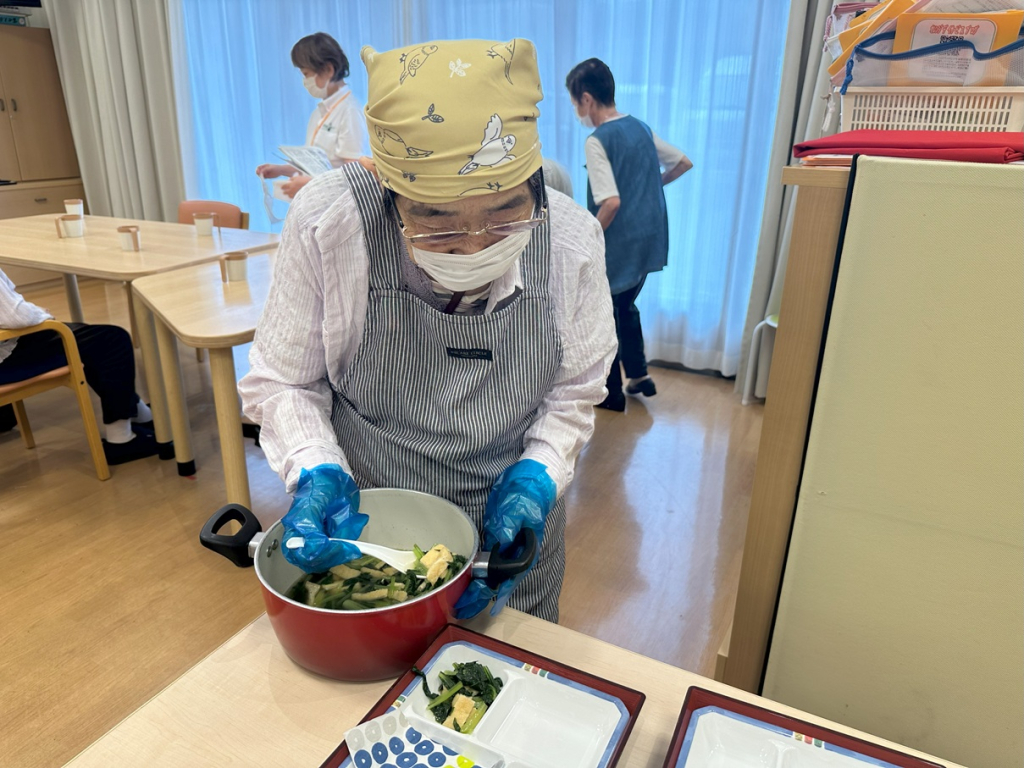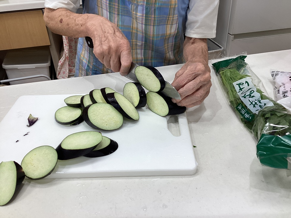 ご利用者の皆さんが、職員と一緒に調理に参加。包丁やピーラーを手に真剣な表情で食材と向き合う姿には、長年家族のために台所に立ってこられた経験と誇りが表れていました。