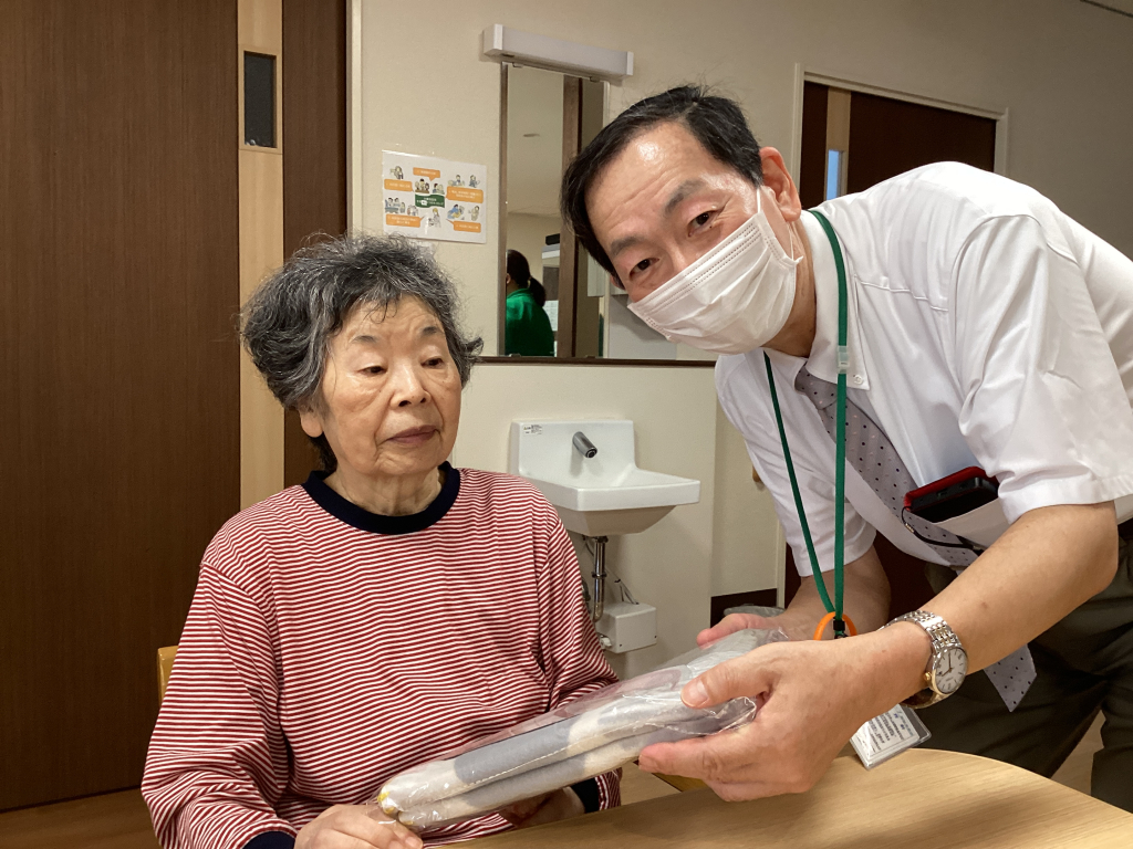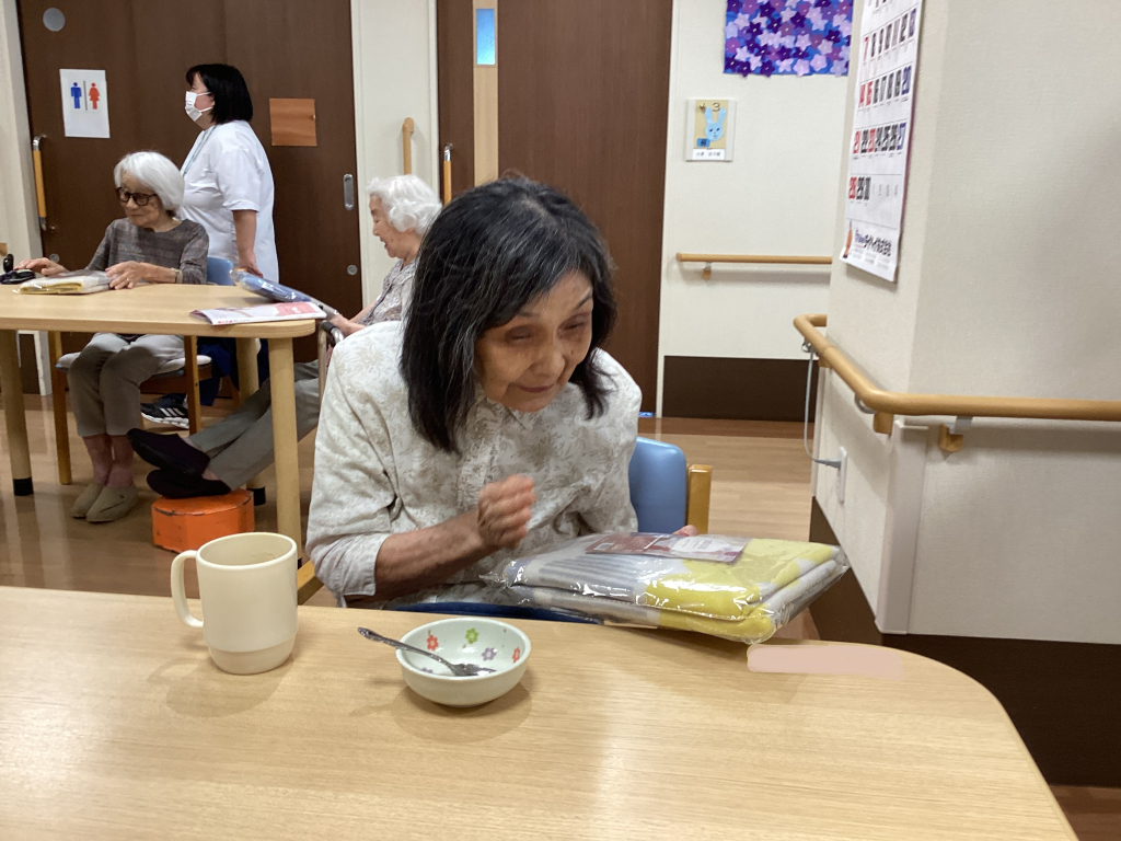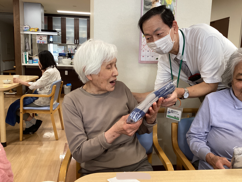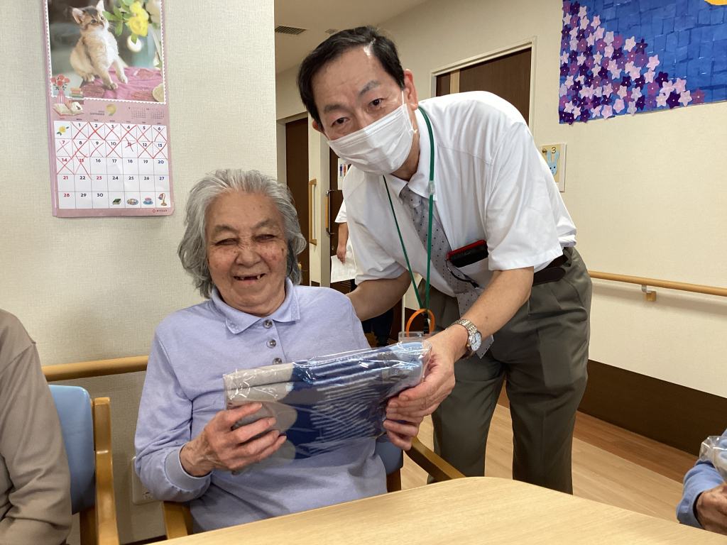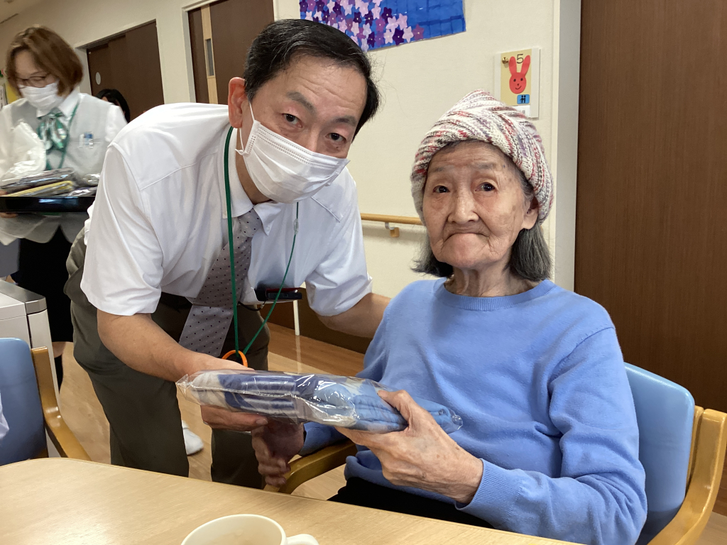 最高齢を迎えられた2名の入居者様にはバスタオルを贈呈させていただき