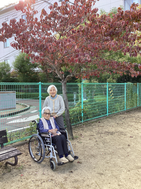 施設に戻る途中、公園に寄って赤くなった葉っぱの