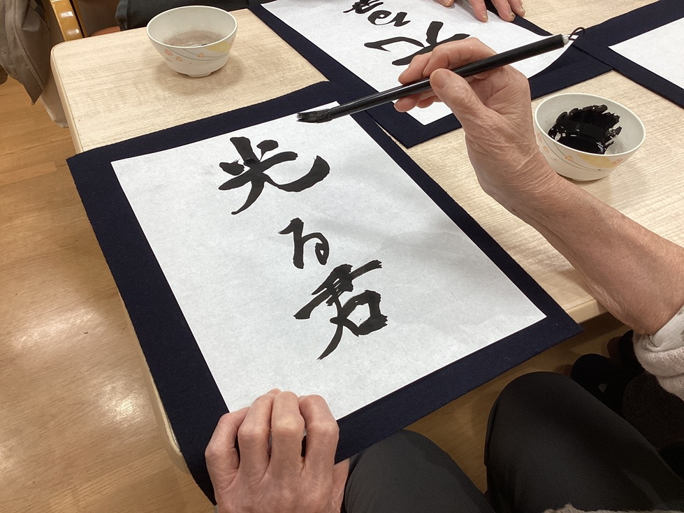 ご利用者は、心を落ち着けながら筆を運び、文字の形やバランスを丁寧に整えられていました。完成した作品からは、みなさまの想いと集中した時間の美しさが感じられました。