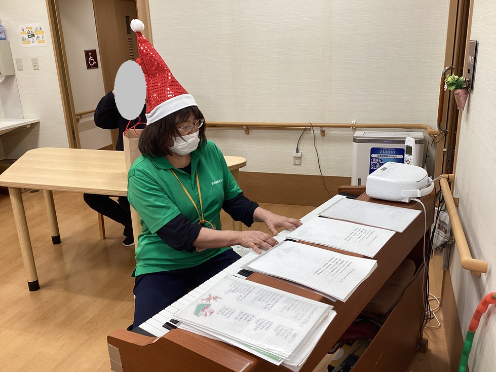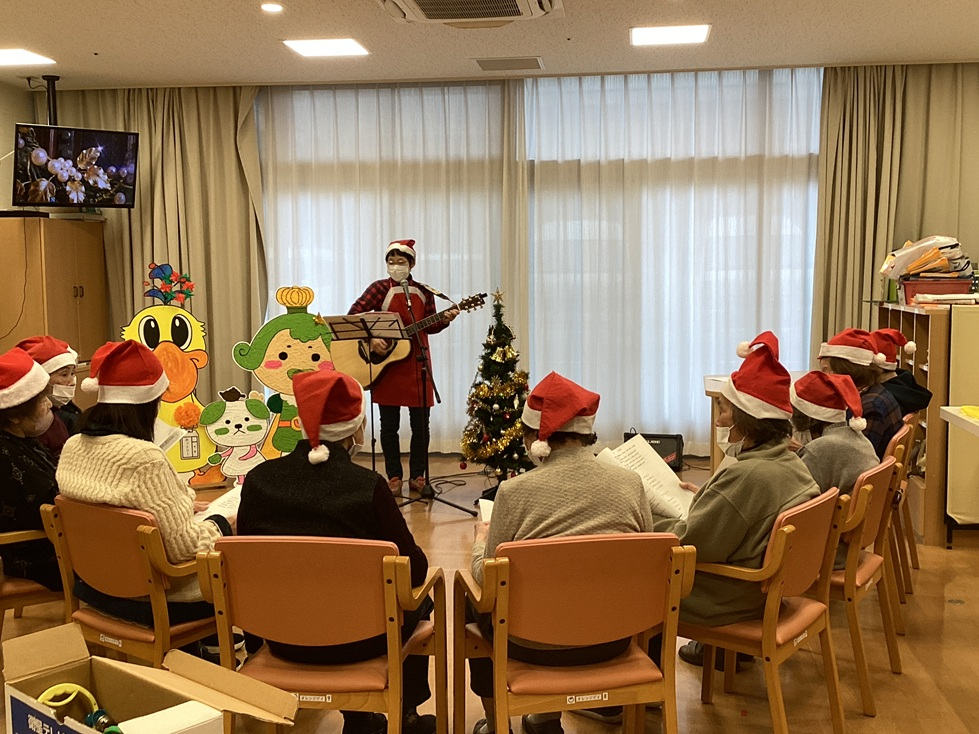 続いて、ボランティア様によるギター演奏と職員のピアノ伴奏に合わせ、皆さまで歌唱を楽しみました。クリスマスソングとして「あわてんぼうのサンタクロース」「赤鼻のトナカイ」「きよしこの夜」を歌い、手拍子や笑顔があふれる楽しい時間となりました。「サンタさん来るかな」「赤鼻のトナカイ、かわいいね」と会話も弾み、ご利用者同士の交流も自然と深まりました。