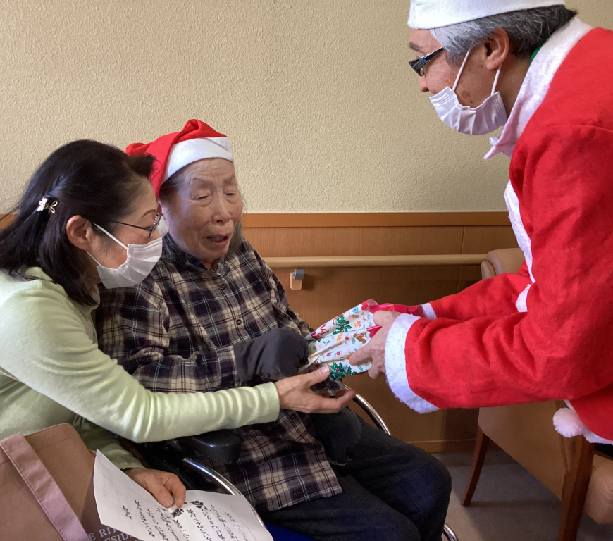 集まった利用者様にサンタクロースからプレゼントを手渡しで