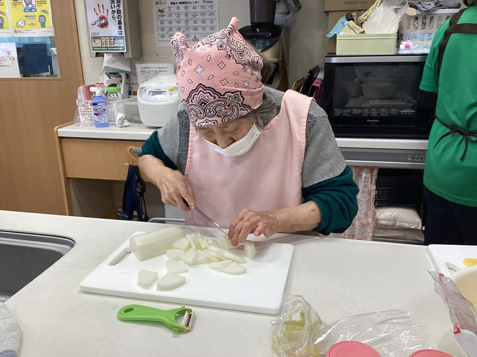 野菜を切る作業では、「昔は毎日台所に立っていたよ」と、懐かしい思い出話をしながら、丁寧に取り組んでくださいました。