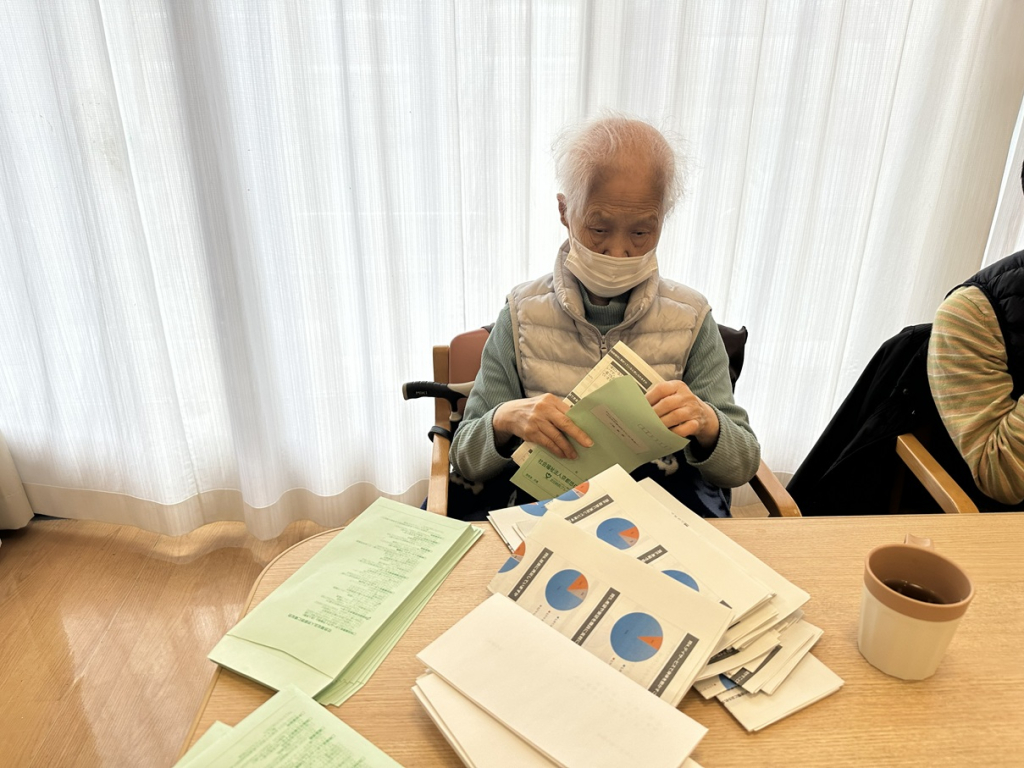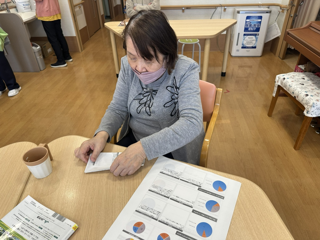 「きれいに入ったかな?」「たくさんあるね」とお話ししながら、和やかな雰囲気の中での作業となりました🌸指先を使う作業は、良いリハビリにもなりますね💡 皆さまのご協力のおかげで、無事に発送することができました📮✨ これからも日々の活動の中で、役割ややりがいを感じていただける機会を大切にしてまいります😊