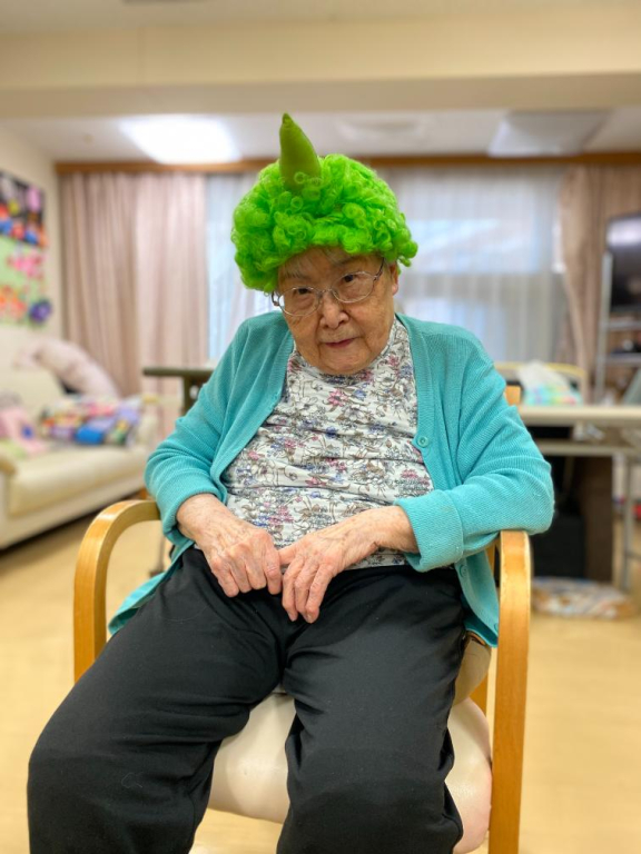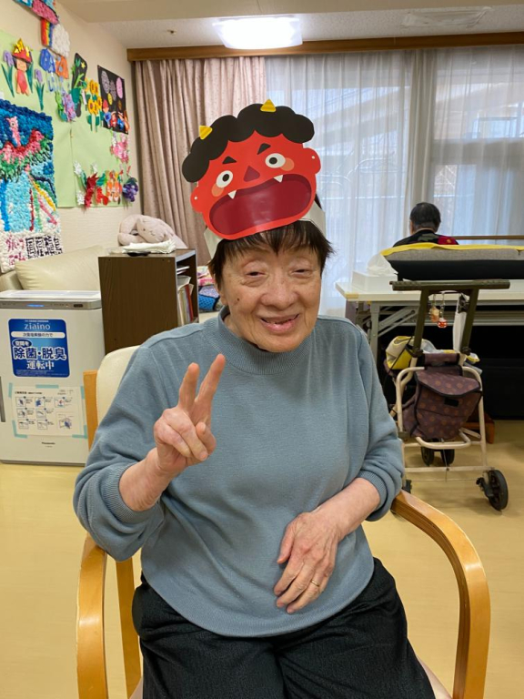 入居者様には赤鬼のお面をかぶっていただき、いよいよ競技スタート!
