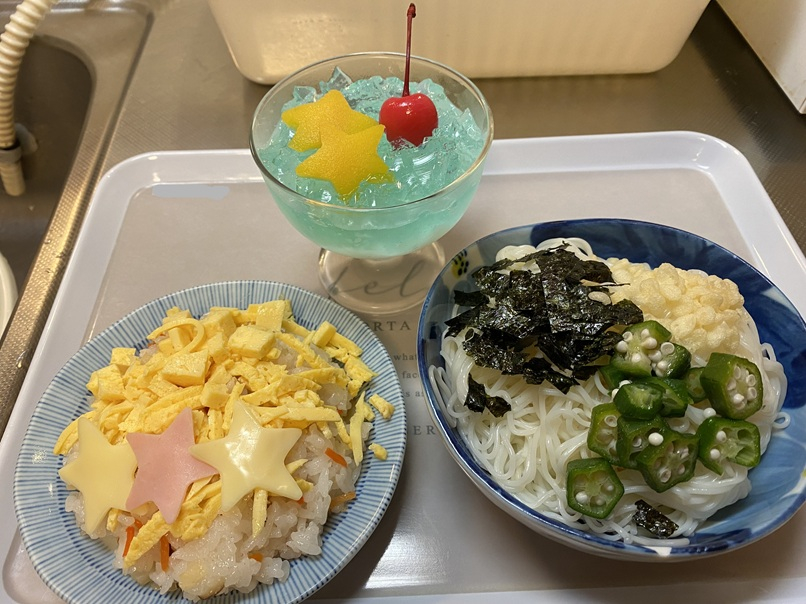 七夕という事で、本日はちらし寿司、そうめん、星のゼリーの昼食行事を行ないました!