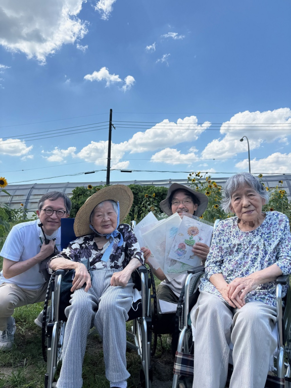 窓の外を眺めていると、ひまわり畑で作業されているAさんの姿を見つけ、ご利用者お2人と一緒に会いに出かけました。