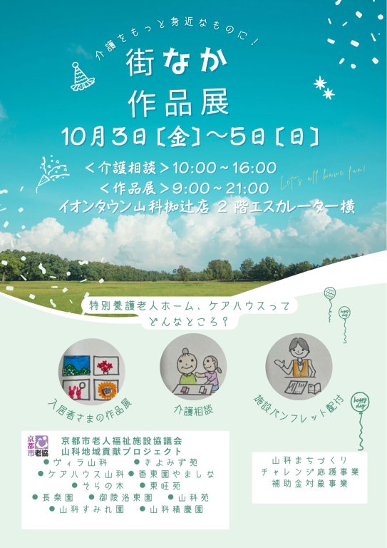 令和7年10月3日(金)~5日(日)10:00~16:00(作品展示は9:00~21:00)、イオンタウン山科椥辻店2階エスカレーター横で「介護をもっと身近なものに~街なか作品展~」が開催され、山科地域の特別養護老人ホームやケアハウスのご利用者の作品を合同で展示することになりました。