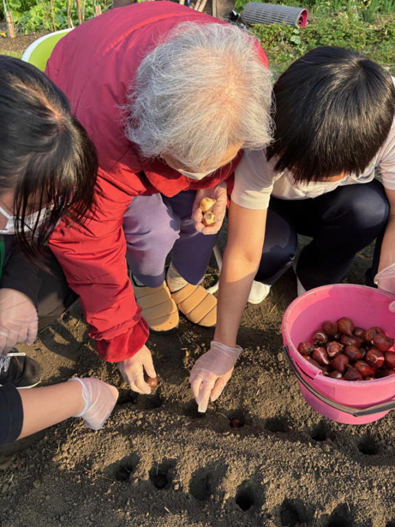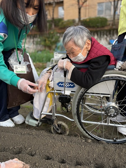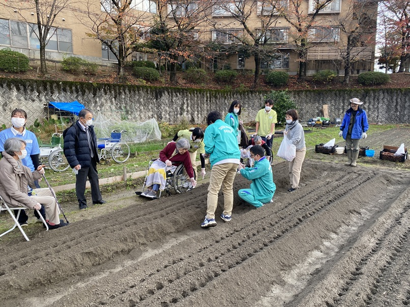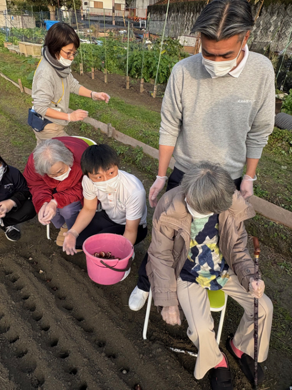 畑では、いつもお世話になっているMさんに教わりながら、赤色、黄色、白の球根を植えていきました。ご利用者さんも器用に穴に球根を投げ入れられ、拍手がわいていました。