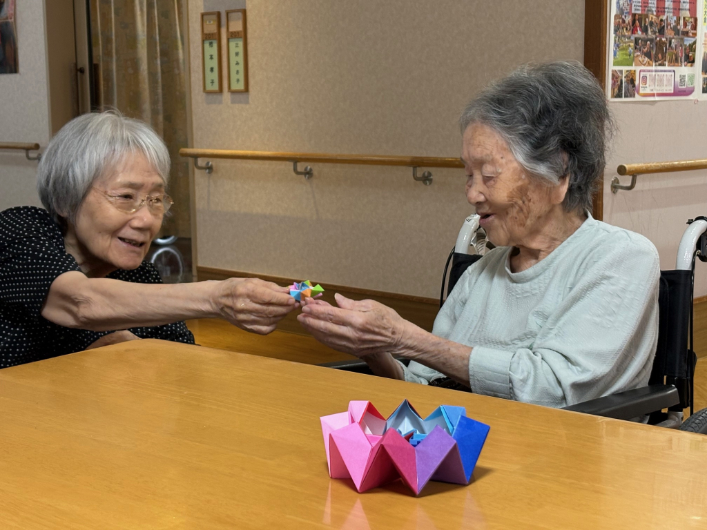 「折紙かあ、昔はようしたけどなあ、もう忘れてもた」「次はどう折るの?」皆さん先生(