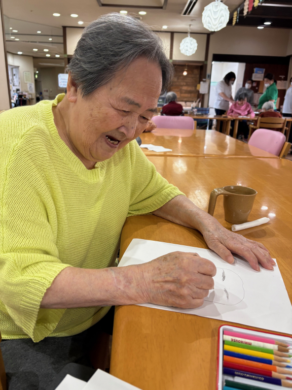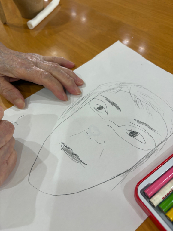 職員が「私の顔を描いてほしいです」とリクエストすると「描けるやろか~」と言いながらサラサラと描き始められました。