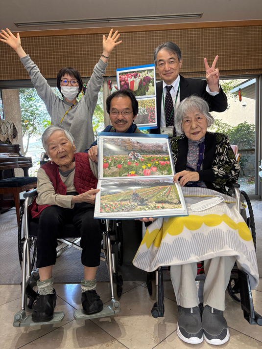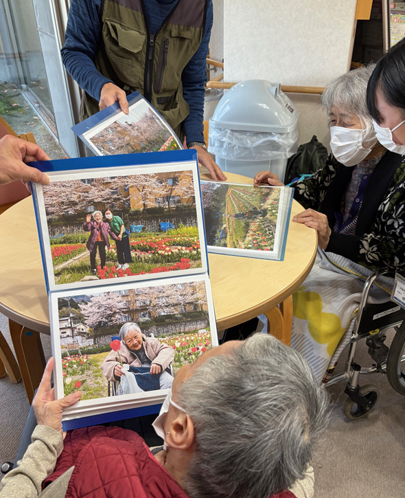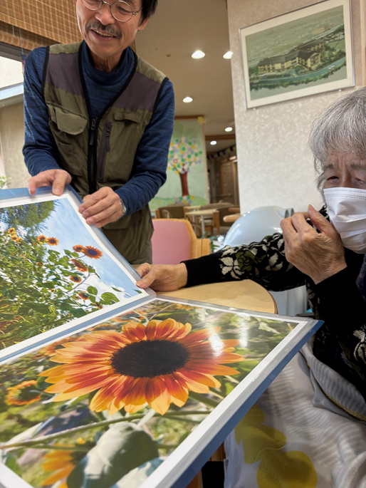花畑のファン達(ご利用者や施設長など)が集まり、わいわいにぎやかに見せていただきました。なんと、たくさんの美しい写真はご寄附いただけるとのこと(ありがとうございます!!)。