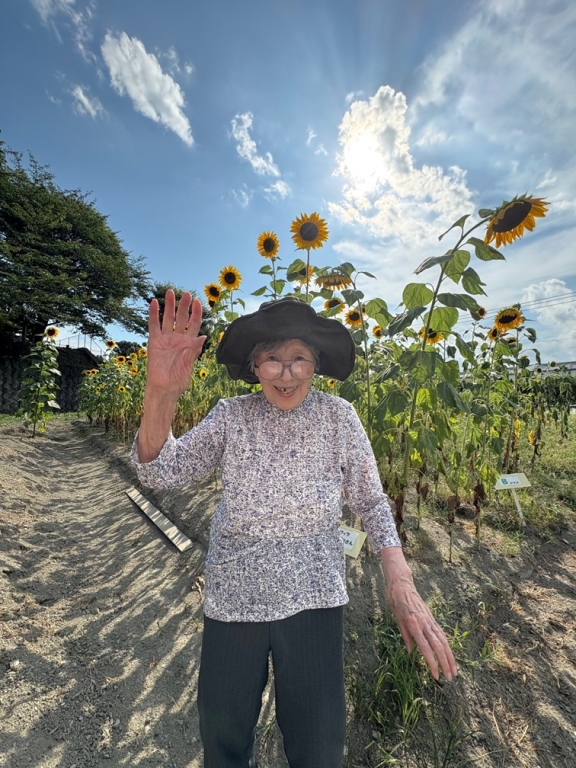 この写真は、施設の隣のひまわり畑で京都橘大学の学生と一緒に種まきをした後、立派に咲いたひまわりを見に出かけた時に撮影したものです。