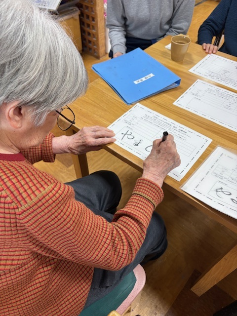 そこで、ご利用者の皆さんと「やましな」の字を書いてみました。「ひらがなって難しいなあ」「漢字の方がかんたんやけど、ひらがなは味があるな」と言いながら、それぞれの「やましな」が書けました。