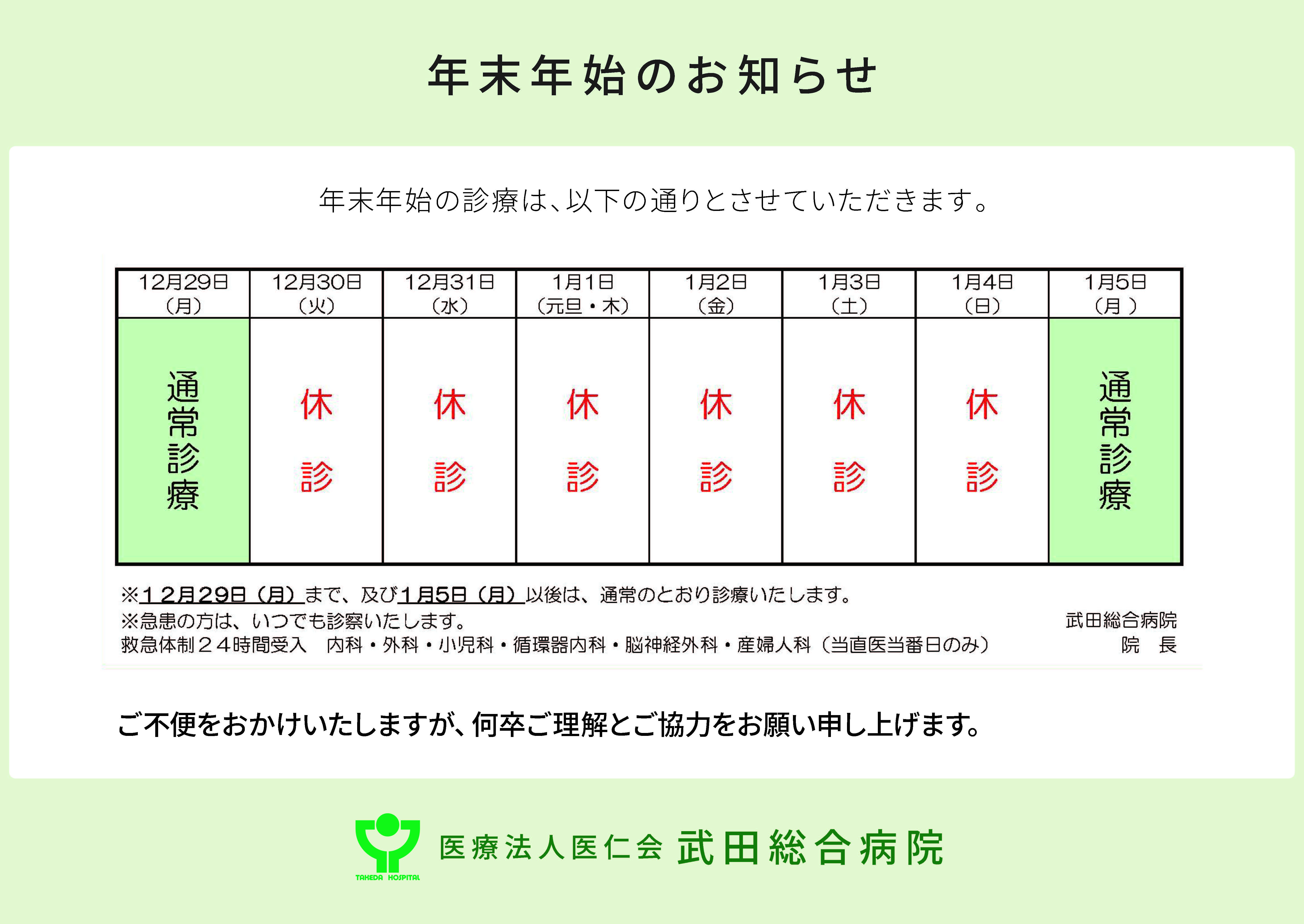 急患は24時間受付 (内科・外科・循環器内科・脳神経外科・小児科・産婦人科[当直医当番日]のみ)