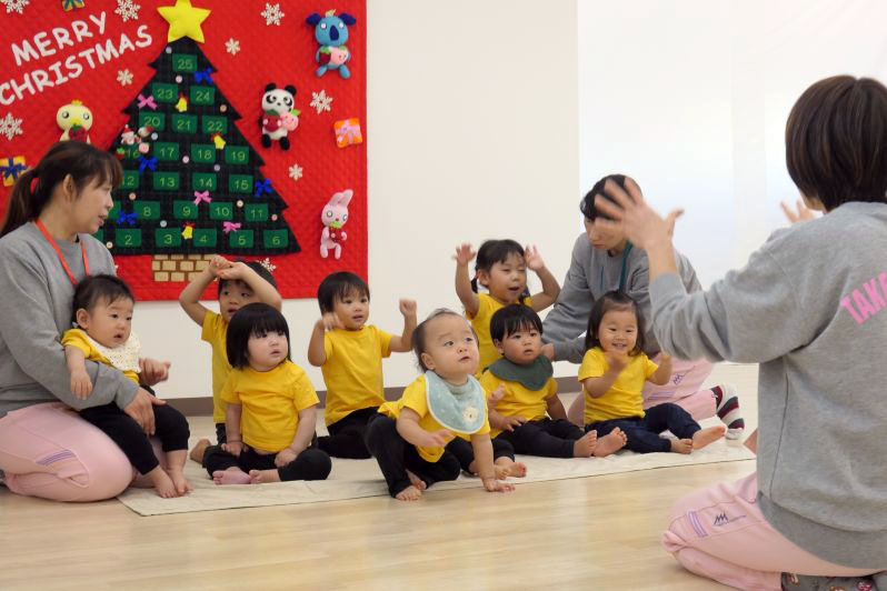 12月16日(火)たけだ保育園では、子どもたちの笑顔がはじけるクリスマス会が開催されました! 黄色いTシャツにカラフルなボンボンをつけた園児たちは、朝からワクワクが止まらない様子。会場は一足早くクリスマスムードに包まれました。