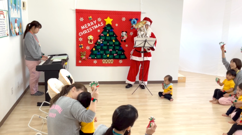 出し物のクライマックスは、「赤鼻のトナカイ」の歌。歌い終わると、なんとユーフォニアムを持ったサンタクロースさんが登場! 予想外のサプライズに、子どもたちからは歓声があがりました。サンタさんと保育士さんによる「ジングルベル」と「きらきら星」の演奏が始まると、園児たちは鈴を鳴らしながら、楽しそうに歌い、会場全体が一体となって音楽を奏でました。